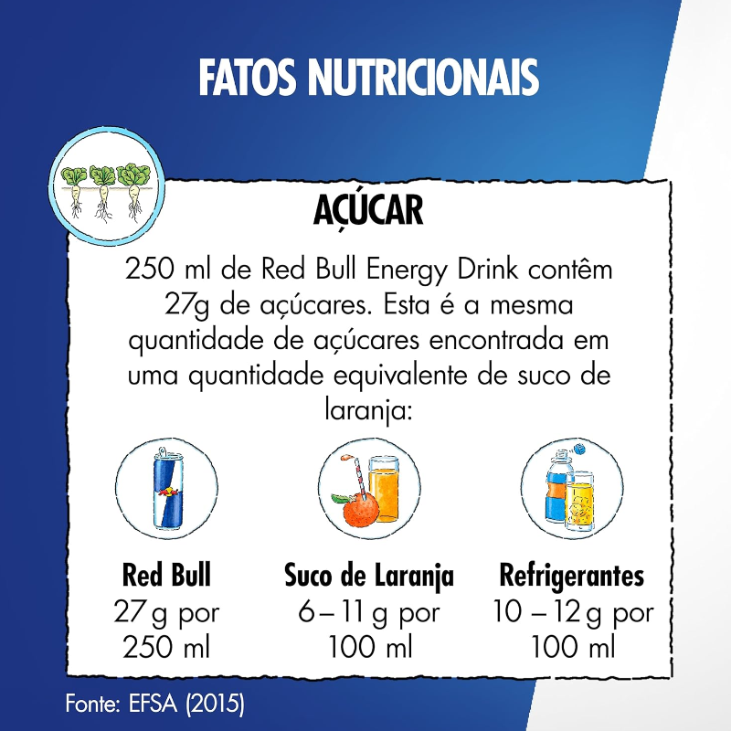 Energético Red Bull Energy Drink, 250 ml (4 latas) RED BULL TE DÁ ASAS Inspirado por bebidas funcionais do Extremo Oriente, Dietrich Mateschitz fundou a Red Bull em meados dos anos 80. Ele criou a fórmula e desenvolveu o conceito de marketing exclusivo ao lançar o primeiro Red Bull Energy Drink em 1º de abril de 1987 na Áustria. Uma nova categoria de produtos – Energéticos - nascia. QUANDO BEBER O Red Bull Energy Drink é apreciado em todo o mundo por atletas de elite, profissionais dinâmicos, estudantes ativos e motoristas em viagens longas. O QUE EXISTE DENTRO DA LATA Cafeína: A cafeína já era conhecida por seus efeitos estimulantes pelas civilizações antigas, que a consumiam a partir de fontes naturais como o chá, café grãos de cacau e noz de cola. Taurina: Taurina é um aminoácido natural do corpo humano, que está presente na dieta diária das pessoas e está envolvida numa vasta gama de processos biológicos. Vitaminas do grupo B: As vitaminas são micronutrientes essenciais necessários para manter as funções normais do organismo. Açúcares: Red Bull Energy Drink é feito com açúcar proveniente da beterraba. Água das fontes Alpinas: Naturalmente, a água é um ingrediente crucial da Red Bull.