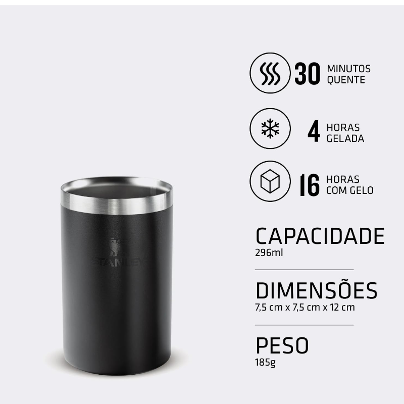 Mais uma novidade na linha Stanley Bar! O novo CAN COOLER é uma alternativa versátil para momentos de comemoração e lazer, que funciona como copo e como porta-latas. Possui design interno que permite o encaixe de latas de 350ml, e tem acabamento 100% em aço inox, o que permite que seja utilizado também como copo. Caraterísticas: Aço inoxidável 18/8 reciclado; Parede dupla com isolamento a vácuo; Livre de BPA; Pode ser lavado na máquina de lavar louça; Compatível com latas de 350ml. Dimensões: 7,5cm x 7x5cm x 12cm