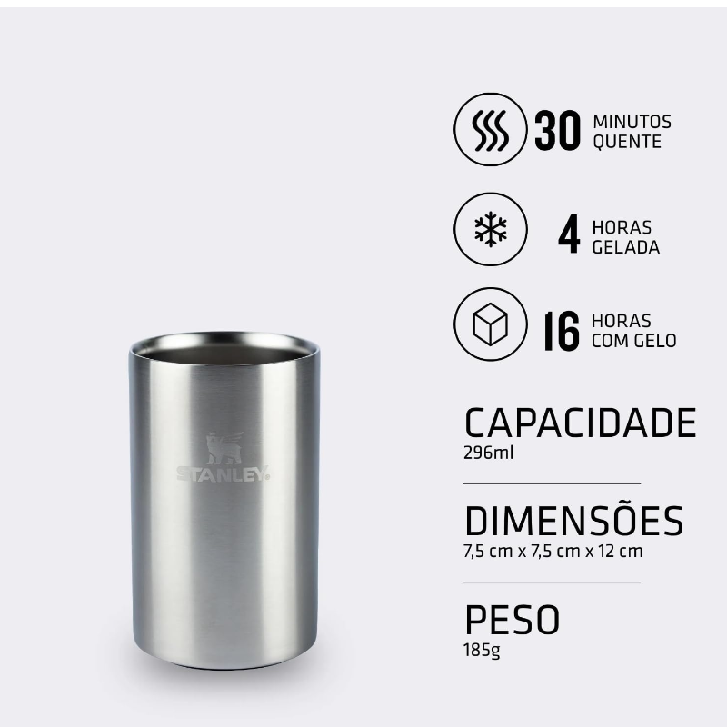 Mais uma novidade na linha Stanley Bar! O novo CAN COOLER é uma alternativa versátil para momentos de comemoração e lazer, que funciona como copo e como porta-latas. Possui design interno que permite o encaixe de latas de 350ml, e tem acabamento 100% em aço inox, o que permite que seja utilizado também como copo. Caraterísticas: Aço inoxidável 18/8 reciclado; Parede dupla com isolamento a vácuo; Livre de BPA; Pode ser lavado na máquina de lavar louça; Compatível com latas de 350ml. Dimensões: 7,5cm x 7x5cm x 12cm
