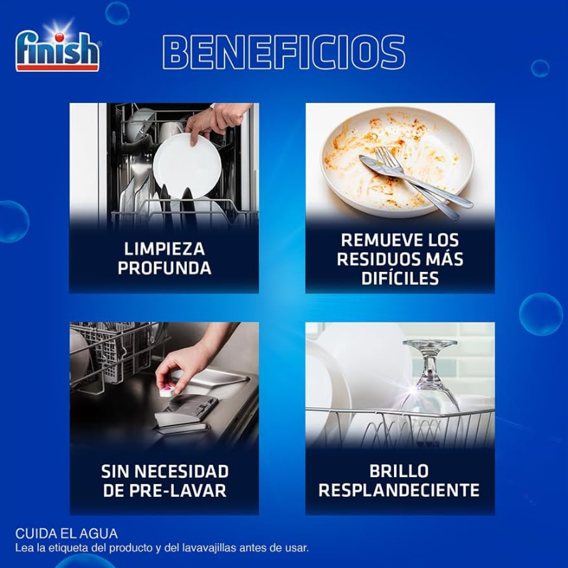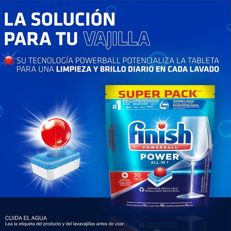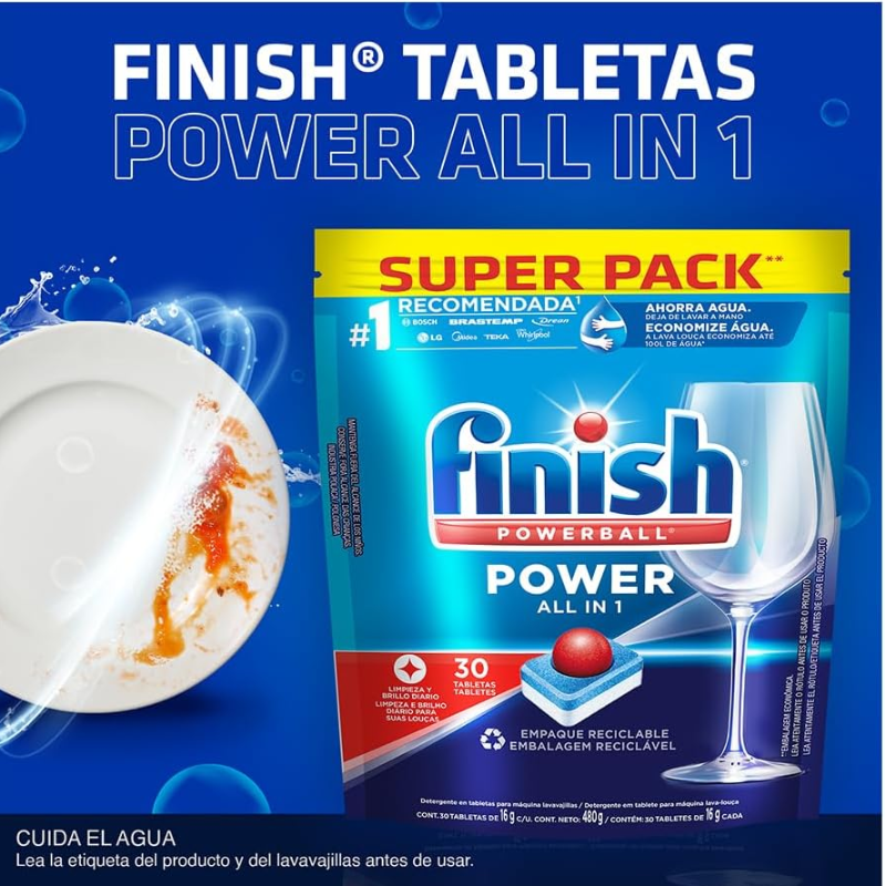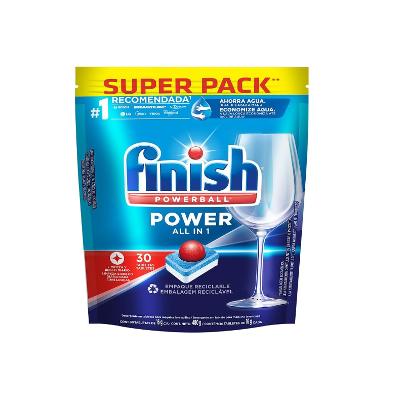 Finish Powerball All in one Max Tabletes é o seu detergente lava louças que oferece limpeza poderosa e brilho perfeito em um único tablete. Finish é a marca Nº1 em detergente para lava louças no mundo! É muito mais que um sabão lava louças, pois sua exclusiva tecnologia Powerball combinada com agentes secantes deixam sua louça limpa, brilhante e seca, sem necessidade de pré enxague. Vem pronto para usar, é só colocar na máquina, sem retirar a película plástica, e deixar a mágica acontecer. Dispensa até mesmo a pré-lavagem. Finish lava louças amolece os restos de comida, elimina resíduos e manchas, e a ação efervescente do powerball libera bolhas com agentes de limpeza e remove até mesmo a sujeira pesada. O resultado são louças, talheres, copos e até panelas brilhantes! Sabao Finish Powerball All in one Max, limpeza poderosa, brilho perfeito! O mais recomendado Produto de alta tecnologia, que além de eliminar a sujeira sem agredir louças e talheres, oferece o melhor custo-benefício e resultados da categoria. Sabao para lava louça Finish é a marca Nº1 em recomendação pelos principais fabricantes de Máquinas de Lava Louça*. Para Finish Powerball All in one Max lava louças sabao, sinônimo de qualidade e confiança, missão dada é missão cumprida. Invista em qualidade de vida Sua vida está em constante mudança e você faz questão de preparar a sua refeição em casa, mas não quer se preocupar com a pilha de louça suja. Sabao lava loucas Finish te ajuda nesta missão! Usar sabão maquina de lavar louça Finish é prático e eficiente, remove gordura e até as sujeiras mais difíceis, sem bagunça, sem ressecar as mãos, e o melhor, com economia de água**. Ele também cuida e protege a louça, aproveite seu tempo com o que mais ama e deixe a louça por conta de Finish Powerball All In One Max Tabletes. E, para uma experiência mais completa, experimente Finish Secante para louças mais secas e brilhantes! Qualidade e vanguarda Há mais de 60 anos na vanguarda de produtos para lava louças automáticas e comercializada em mais de 70 países, a Finish realiza constantes pesquisas para oferecer sempre o melhor para seus consumidores. O resultado são louças perfeitamente limpas, secas e brilhantes. Experimente outros produtos Finish para máquina lava louça: Finish Powerball Quantun, Finish Advanced Power Powder e Finish Secante. *Nº1 recomendação – Finish é o detergente mais recomendado pelos principais fabricantes de Lava Louças (Bosch, Whilpool, Brastemp, Beko, Sharp, Siemens, Eletrolux, LG, Blomberg) **Em comparação com a lavagem manual segundo estudo lhne_investigation of chemical and microbiological residues – Instituti Für Landtechnik, 2006