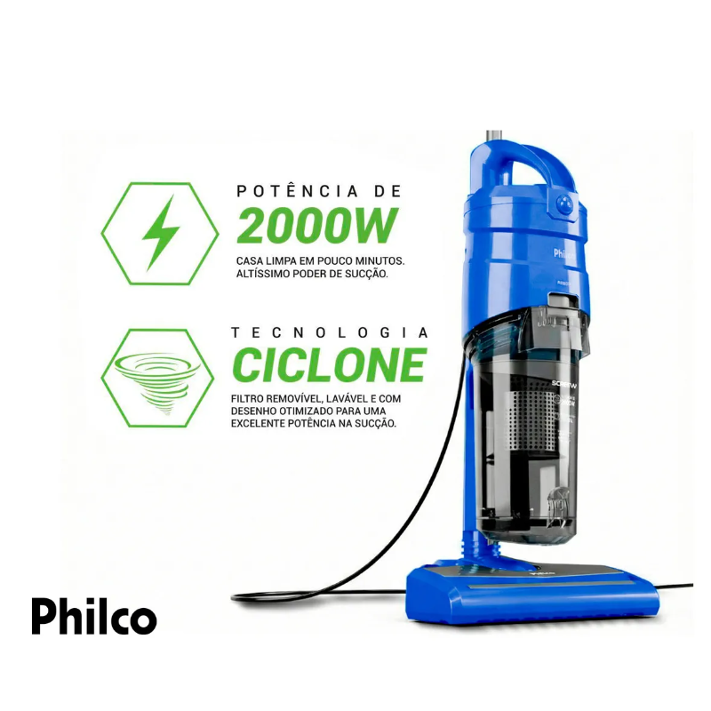 O aspirador de pó Philco PAS32 Power Clean oferece alta potência e praticidade para a limpeza doméstica. Com 2000W e tecnologia ciclone, mantém a sucção constante sem perda de desempenho. Possui reservatório de 2 litros lavável e desmontável, dispensando o uso de saco descartável. O design 2 em 1 permite o uso como aspirador vertical ou portátil de mão, ideal para diferentes superfícies e necessidades do dia a dia.