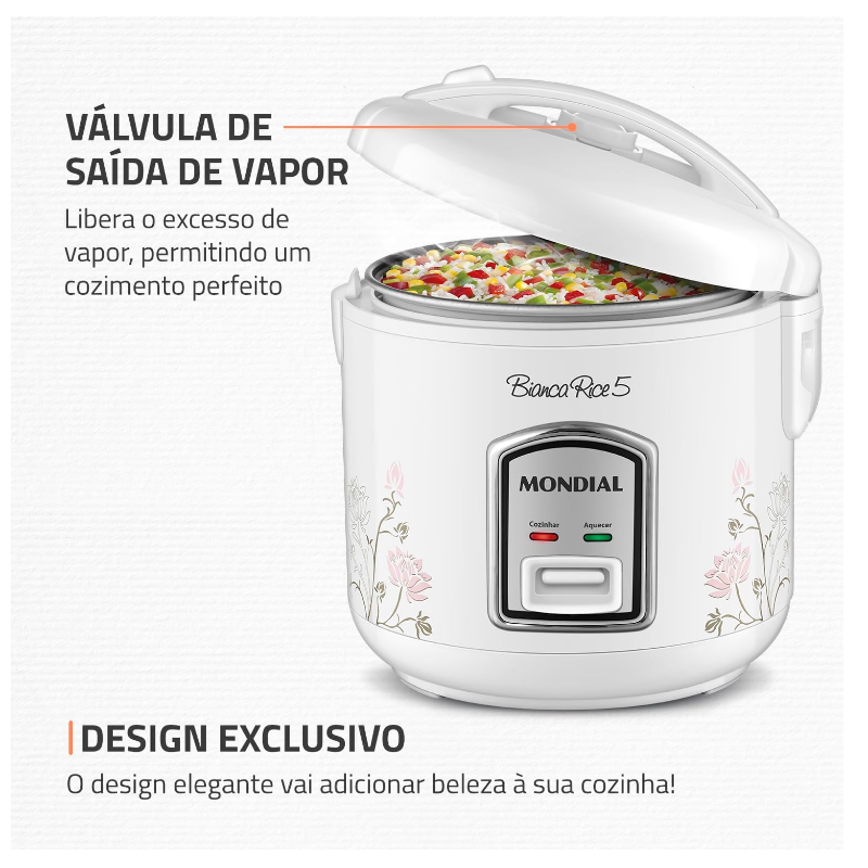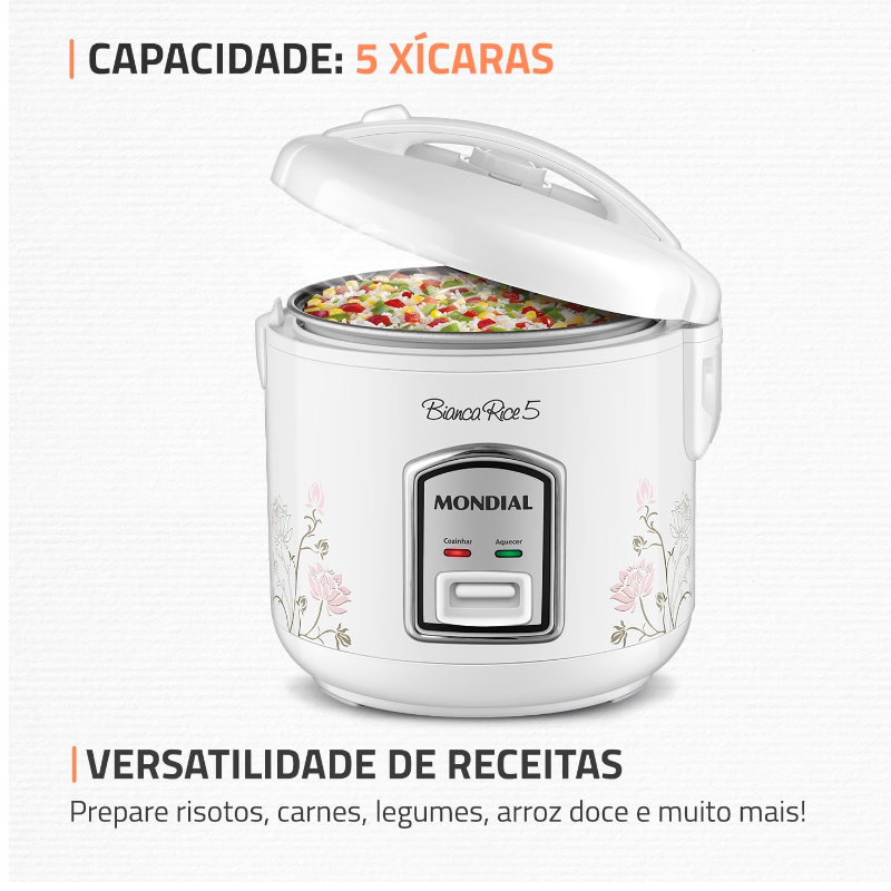 CAPACIDADE DE 5 XÍCARAS: A panela de arroz Mondial tem a capacidade ideal para o arroz do dia a dia e outras receitas.