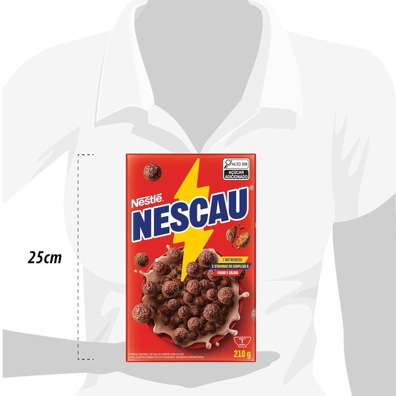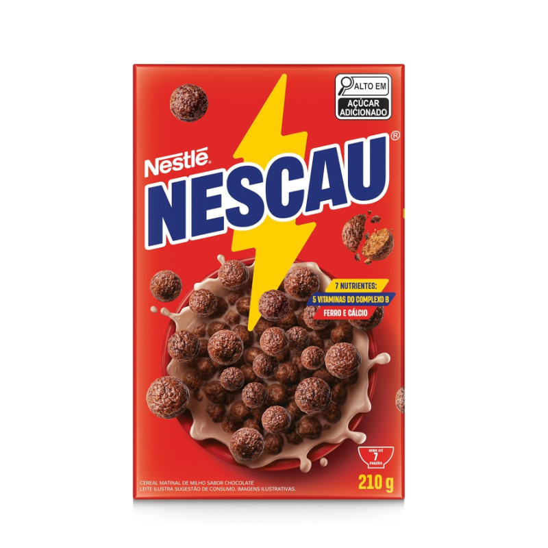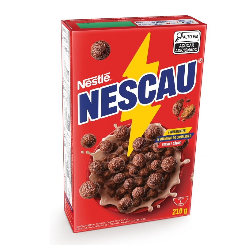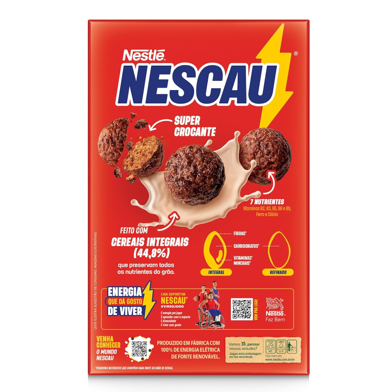 "Bolinhas supercrocantes feitas com o delicioso sabor de NESCAU! Mais sabor e energia para o dia começar com tudo. CONTÉM GLÚTEN. Ingredientes: Farinha de milho integral (39%), farinha de milho enriquecida com ferro e ácido fólico (21%), açúcar, xarope de glicose, cacau em pó (3%), oleína de palma, minerais [cálcio (carbonato de cálcio), ferro (ferro eletrolítico) e zinco (óxido de zinco)] e vitaminas [ácido pantotênico (pantotenato de cálcio), niacina (nicotinamida), B2 (riboflavina), B6 (cloridrato de piridoxina) e ácido fólico (ácido N-pteroil-L-glutâmico)], sal, aromatizantes, antiumectante fosfato dicálcico, corante caramelo IV, estabilizante fosfato trissódico e antioxidante tocoferol."