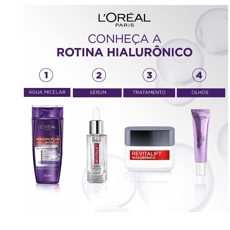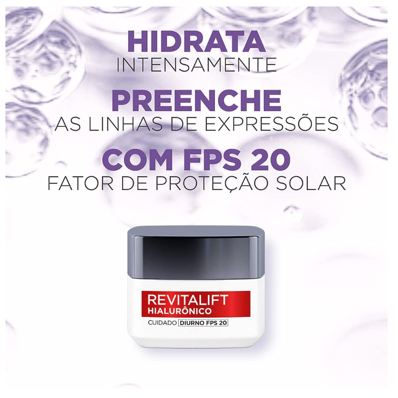 Conheça o Kit Revitalift Hialurônico de L'Oréal Paris, a sua rotina de skincare anti-idade completa para o dia e para a noite. Enriquecido com Ácido Hialurônico puro, este tratamento foi desenvolvido para todos os tipos de pele que buscam hidratação intensa e preenchimento de rugas e linhas. Este kit combate os sinais do envelhecimento com uma poderosa combinação de Ácido Hialurônico e Pro-Retinol. O tratamento diurno hidrata profundamente, suaviza as linhas de expressão e protege a pele com FPS 20, garantindo um aspecto mais jovem ao longo do dia. À noite, o creme noturno age reparando a pele, preenchendo as rugas mais profundas e restaurando a vitalidade enquanto você dorme. A tecnologia de Revitalift Hialurônico oferece uma melhora global no aspecto da pele, reduzindo os pés de galinha e outras marcas de expressão em poucas semanas, resultando em uma pele revitalizada e tonificada. Transforme sua pele com o tratamento duplo de Revitalift Hialurônico de L'Oréal Paris. Adquira já o seu kit e revele uma pele visivelmente mais jovem e preenchida!