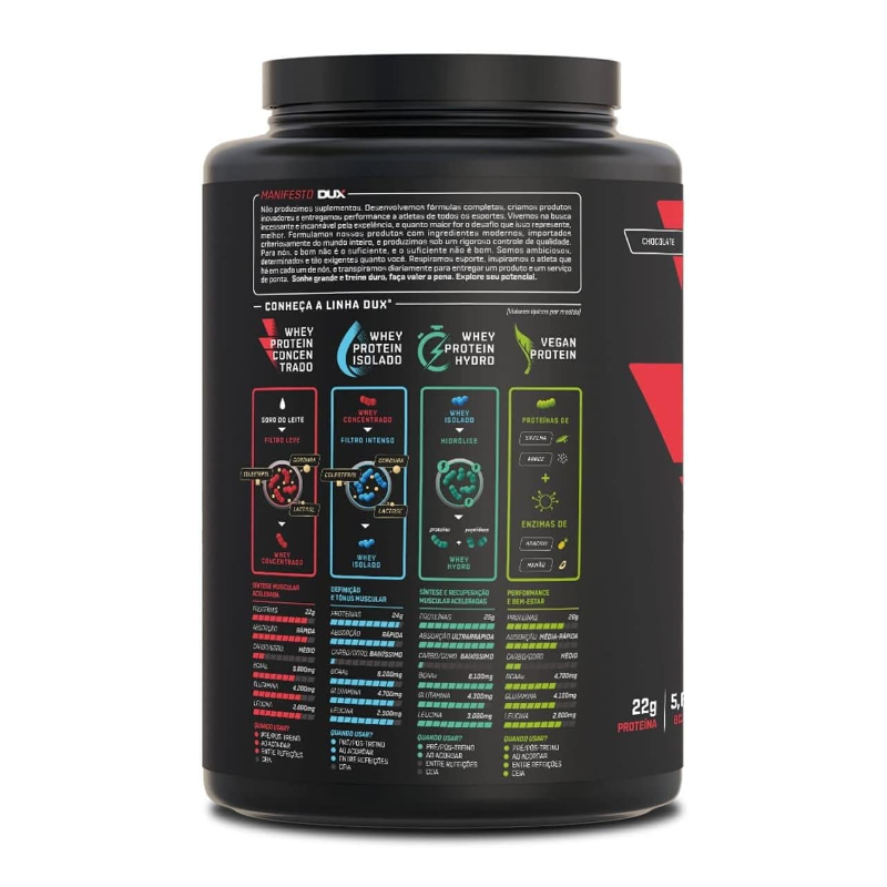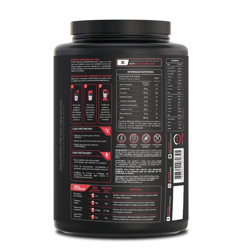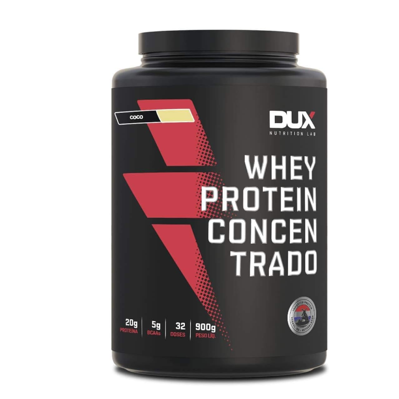 WHEY PROTEIN CONCENTRADO (900g) - DUX NUTRITION O Whey Protein Concentrado Dux Nutriton é composto por proteínas de alto valor biológico e rápida absorção, além de gorduras essenciais, carboidratos e uma ampla gama de aminoácidos, fundamentais para garantir a síntese muscular acelerada após a prática de esportes. É ideal para ser consumido antes e depois de treinos, mas também pode fazer parte do café da manhã ou servir como um lanche entre as refeições, e em outros momentos conforme a orientação do seu nutricionista. Se há um nutriente indispensável, é a proteína. Ela é feita de aminoácidos, que são os blocos de construção do nosso corpo. A proteína do soro do leite, em inglês ?Whey Protein?, é uma das fontes de aminoácidos de melhor absorção, maior até que o frango ou peixe. Isso torna o Whey uma forma conveniente de ingerir proteína, melhorando a saúde, o bem-estar e os resultados dos treinos. BENEFÍCIOS: > Não contém goma xantana, complexos vitamínicos à base de maltodextrina, espessantes, estabilizantes, conservantes ou qualquer outro ingrediente inferior;> Contém corantes 100% naturais, sem ingredientes artificiais;> O nome diz tudo: Whey Protein Concentrado 100% puro, com transparência total, do nome do produto à lista de ingredientes;> Matéria-prima premium importada, com alto teor de leucina, desenvolvida para criar um produto com sabor real e marcante;> Valores nutricionais robustos, sem excessos, com quantidades ideais de carboidratos e gorduras do leite;> 20g de proteína;> Proteína moderna, desenvolvida por especialistas para atletas de esportes de performance (bodybuilding, crossfit e artes marciais), pessoas que buscam uma proteína com baixa caloria (para snacks fit e receitas sem culpa) e pessoas que buscam uma proteína ultrapura de altíssima qualidade.