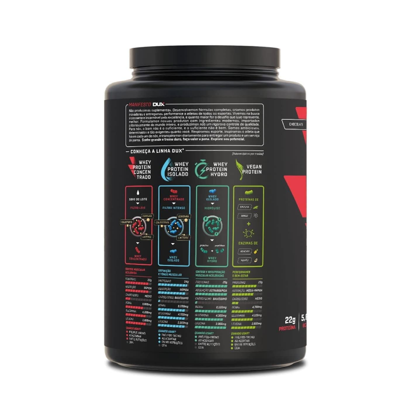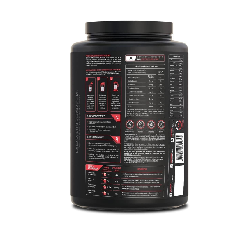 Proteína 100% pura, extraída exclusivamente do soro de leite, sem adição de proteínas inferiores, mais baratasO whey protein concentrado dux possui um perfil nutricional completo e um sabor real, ideal para ser consumido pré ós treinos, como um snack prático, ou em suas receitasNão contém goma xantana, complexos vitamínicos à base de maltodextrina, espessantes, estabilizantes, conservantes ou qualquer outro ingrediente inferiorContém corantes 100% naturais