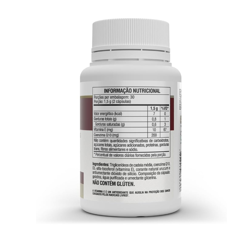 Suplemento alimentar de coenzima Q10 e vitamina E em cápsulas. Maior absorção na forma lipossolúvel; Maior absorção na forma lipossolúvel;Suplemento alimentar. Triglicerídeos de Cadeia Médica (MCT) promovem efeitos sinérgicos que potencializam os benefícios nutricionais da COQ - 10. Possui como veículo em sua formulação TCM (Triglicerídeos de Cadeia Média). É enriquecido com vitamina E (D-L-Alfa Tocoferol) e possui corante natural de urucum.
