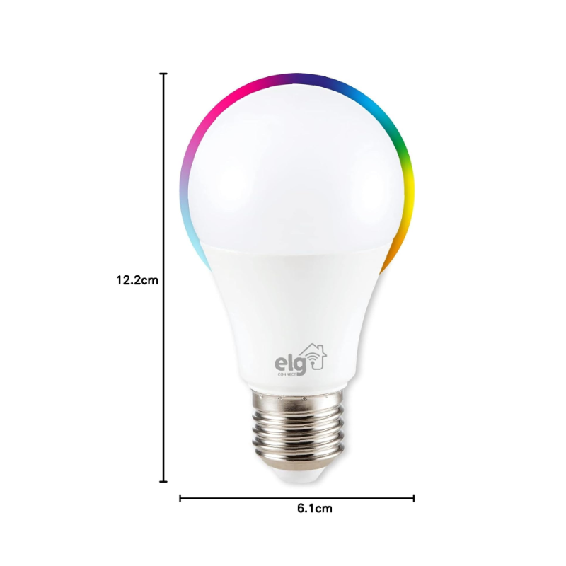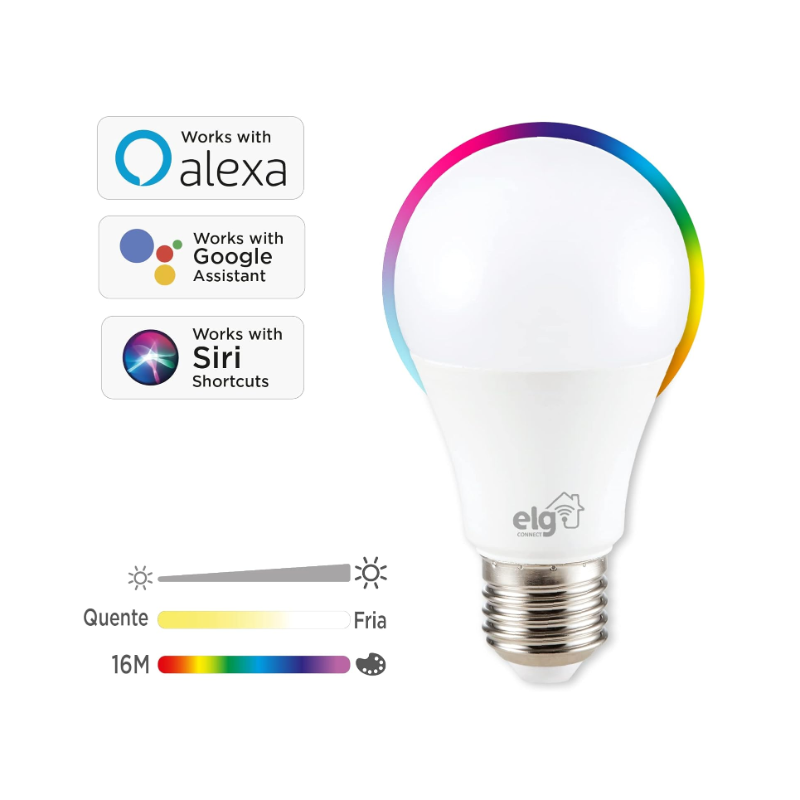 A lâmpada inteligente RGB da ELG é a sua melhor escolha para iluminação e decoração de ambientes internos, residenciais ou comerciais de pequeno a médio porte. Conexão direta, sem necessidade de HUB, criptografia e segurança de dados nível militar. Aproveite suas diversas funções que preparamos pensando na sua melhor experiência: dimerização completa, controle e acionamento remoto, RGB (16 milhões de possibilidades de cores), branco quente e frio, ajuste de intensidade, integração e automação com demais dispositivos ELG CONNECT, comando por voz (Alexa, Google Assistant e Siri Shortcuts), Ritmo circadiano (efeito acordar suave), agendamento e temporizador e sincronização com música (aplicativo aberto e em primeiro plano).