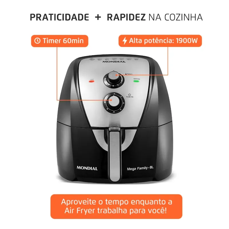 PRATICIDADE E RAPIDEZ NA COZINHA = MAIS TEMPO PARA VOCÊ: A Tecnologia de Circulação de Ar Quente e a alta potência possibilitam rapidez no preparo das receitas. Aliado a isso, a função Timer proporciona a liberdade para você se dedicar a outras tarefas enquanto a Air Fryer trabalha para você.