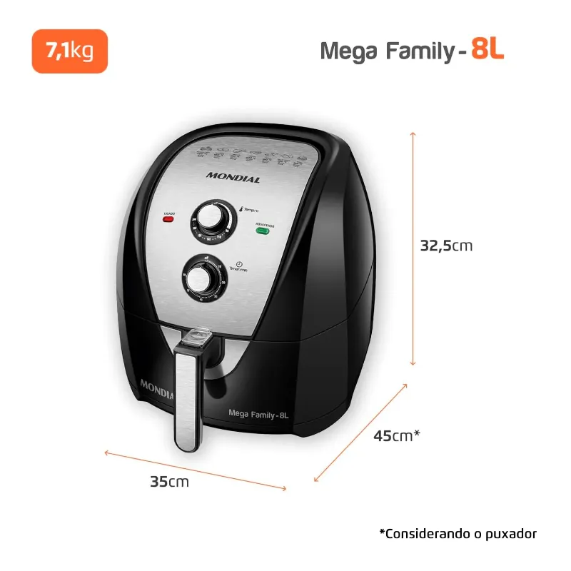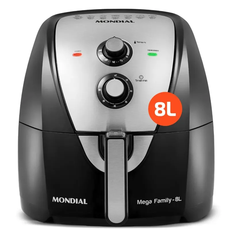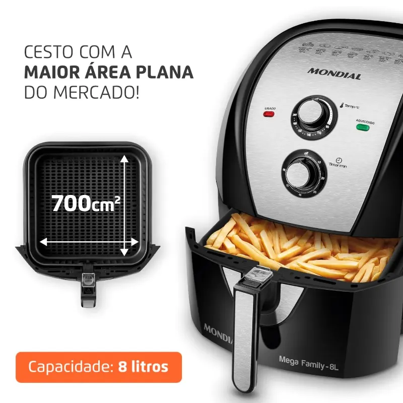 CAPACIDADE: 8 LITROS: A família de Air Fryers Mondial continua crescendo! O cesto quadrado com 700cm² tem a maior área plana do mercado e acomoda melhor os alimentos, permitindo preparar grandes porções, sem empilhar a comida e assando por igual.