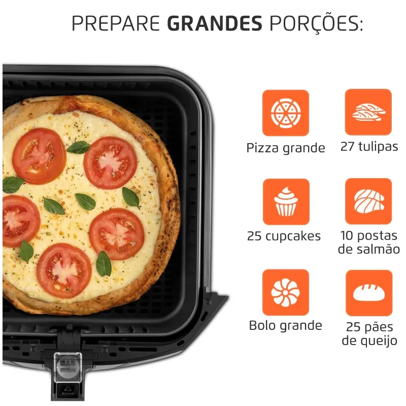 MUITO MAIS QUE BATATA FRITA: INVISTA EM MAIS RECEITAS: A Air Fryer é versátil e permite que você prepare pratos que vão muito além da clássica batata frita. É possível preparar legumes, carnes, peixes, lasanha, pizzas, além de pratos doces, como pudim, bolo de chocolate e cookies. Use sua criatividade e mãos à obra!