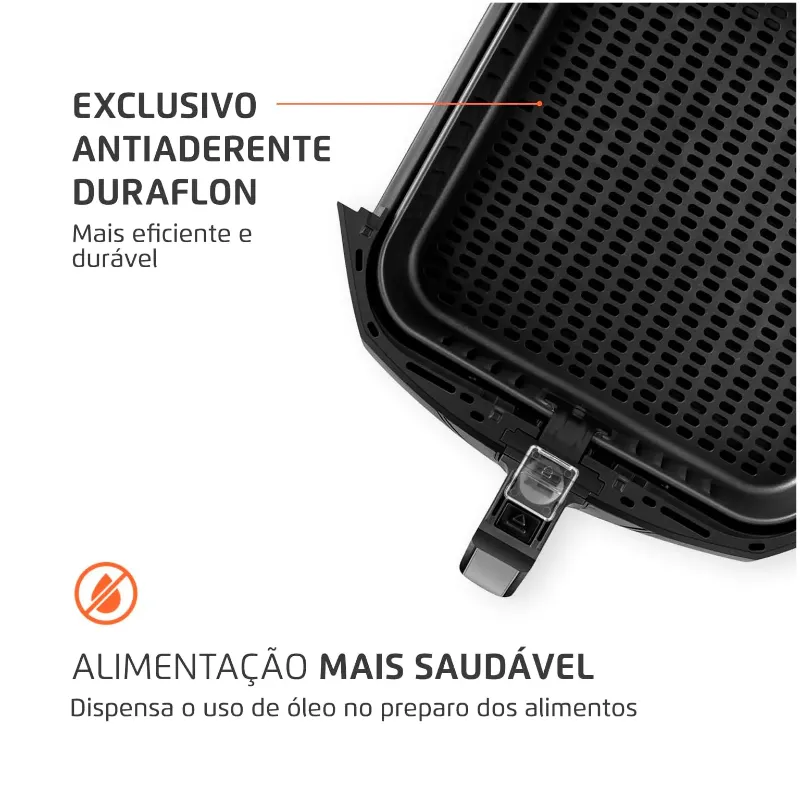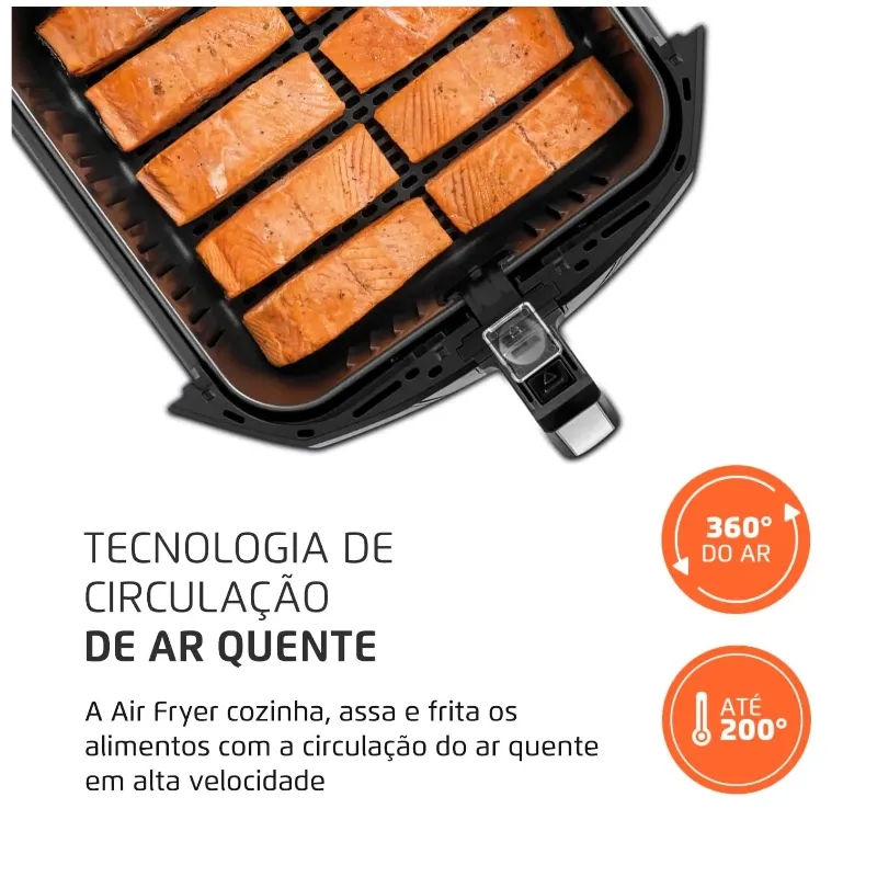 TECNOLOGIA DE CIRCULAÇÃO DE AR QUENTE: A Air Fryer é equipada com uma tecnologia que aquece e circula o ar. O ar superquente envolve e cozinha o alimento, sem a necessidade de usar óleo.
