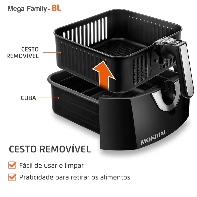 CESTO REMOVÍVEL: Todas as Air Fryers Mondial possuem cesto removível.