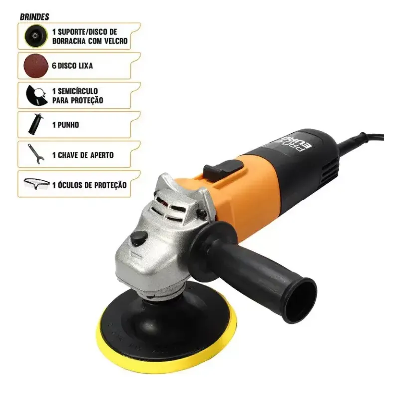 Segura e fácil de manobrar, a Esmerilhadeira conta com duas molas internas de reposição, uma chave para troca do disco, um botão de trava para disco e proteção Anti Fagulhas para que não prejudique a visão do usuário.