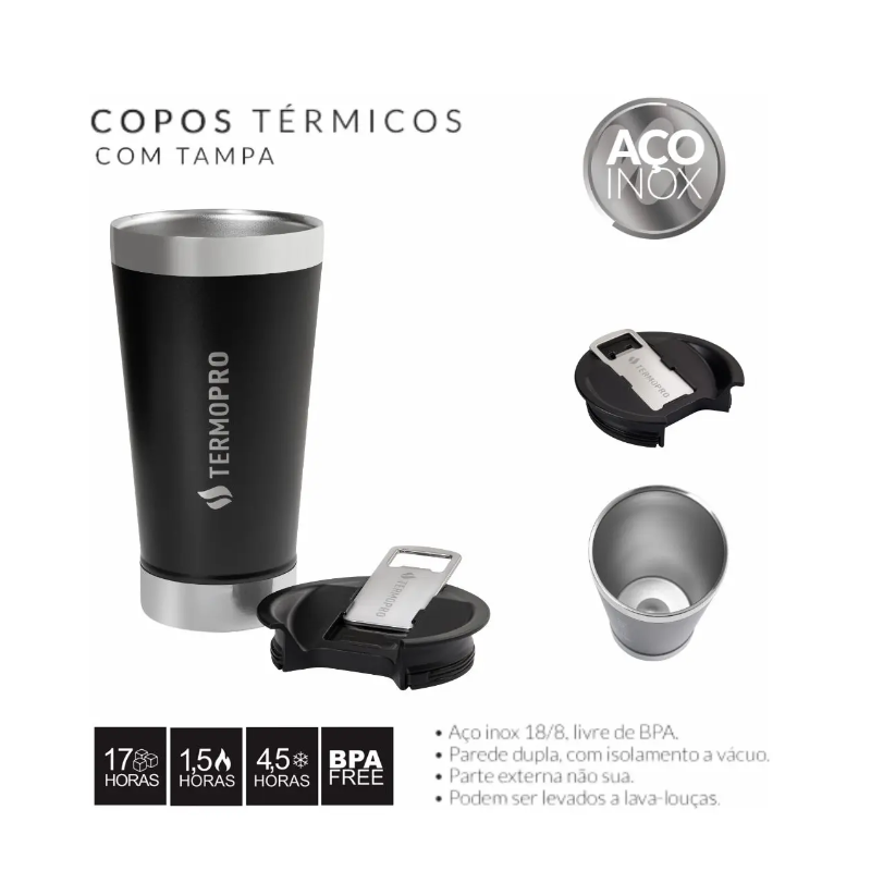 O Copo Térmico Com Tampa e Abridor Preto Termopro é ideal para manter suas bebidas geladas por até 4h30, com gelo por até 17 horas e bebidas quentes por até 1h35. Ele também possui alguns diferenciais, como design, tampa com abridor de garrafa acoplado, alta resistência e durabilidade. Feito em aço inox 18/8. Livre de BPA. Possui parede dupla de aço inox com isolamento a vácuo, por isso, a parte externa não transpira. Pode ser levado à máquina lava-louças. Acompanha tampa com abridor de garrafa acoplado.