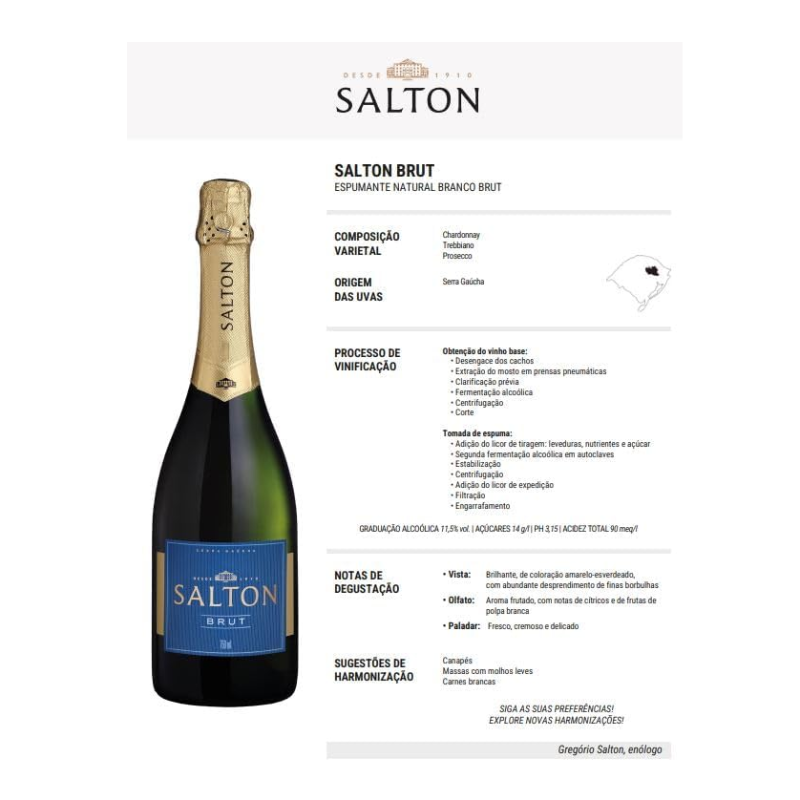 Elaborado com as variedades de uvas Chardonnay, Prosecco e Trebbiano cultivadas na Serra Gaúcha, nosso premiado e reconhecido espumante Salton Brut desprende aromas de flores brancas, frutas de polpa branca e cítricos e, em boca, é refrescante e deliciosamente cremoso.