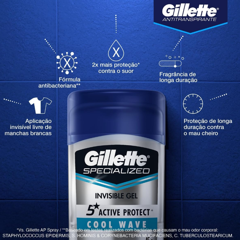Os antitranspirantes Clear gel da Gillette oferecem proteção antibacteriana por até 48 horas contra 99% das bactérias que geram o odor corporal. Ele também fornece fragrância que dura o dia todo. Sistema triplo da proteção de Gillette 3x: • lutas o cheiro mau. • Mantém-no seco. • Fragrância que dura o dia todo