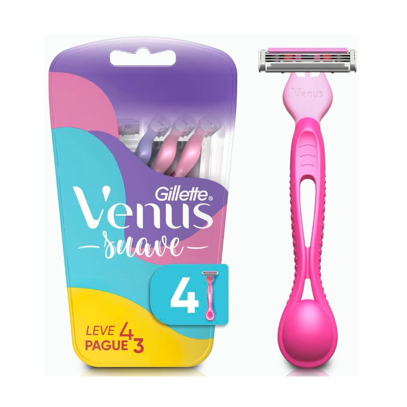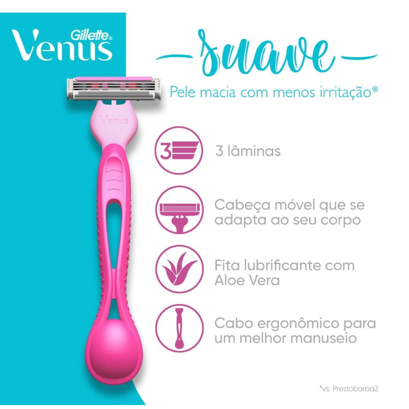 Os aparelho de depilação descartável Gillette Venus Suave possiu uma fita lubrificante com um toque de aloe vera para um melhor deslizamento das lâminas, proporciando uma depilação suave com menos irritação * (vs. Prestobarba2). A cabeça móvel do aparelho femenino Venus Suave se ajusta a suas curvas durante o depilação e suas 3 três lâminas proporcionarão uma depilação rente e maciez por mais tempo* (vs. Prestobarba2). Para uma melhor experiência de depilação, experimente usá-lo com o creme de barbear protetor Gillete Venus.