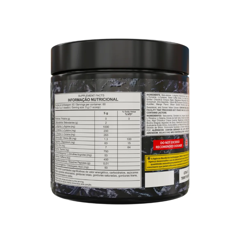 Ingredientes: Beta Alanina, L-Arginina, Taurina, Colostro Bovino em Pó, Cafeína, Cisteína, L-Tirosina, N-Acetil L-Metionina, Ácido Ascórbico, Extrato de café verde, Extrato seco de semente de uva, Alga Chondrus Crispus Invernal, Bisglicinato de Magnésio, Zindo Aspartato, Vitamina B6 (Cloridrato de Piridoxina), Aroma Idêntico ao Natural de Frutas Vermelhas, Corante Vermelho de Beterraba, Acidulante ácido Cítrico, Edulcorante Sucralose. Contém potenciais alergênicos: pode conter amendoim e derivados do leite, da soja e do ovo. Não contém glúten. Produzido em instalação que segue boas práticas de fabricação e processa produtos que contêm esses alergênicos.