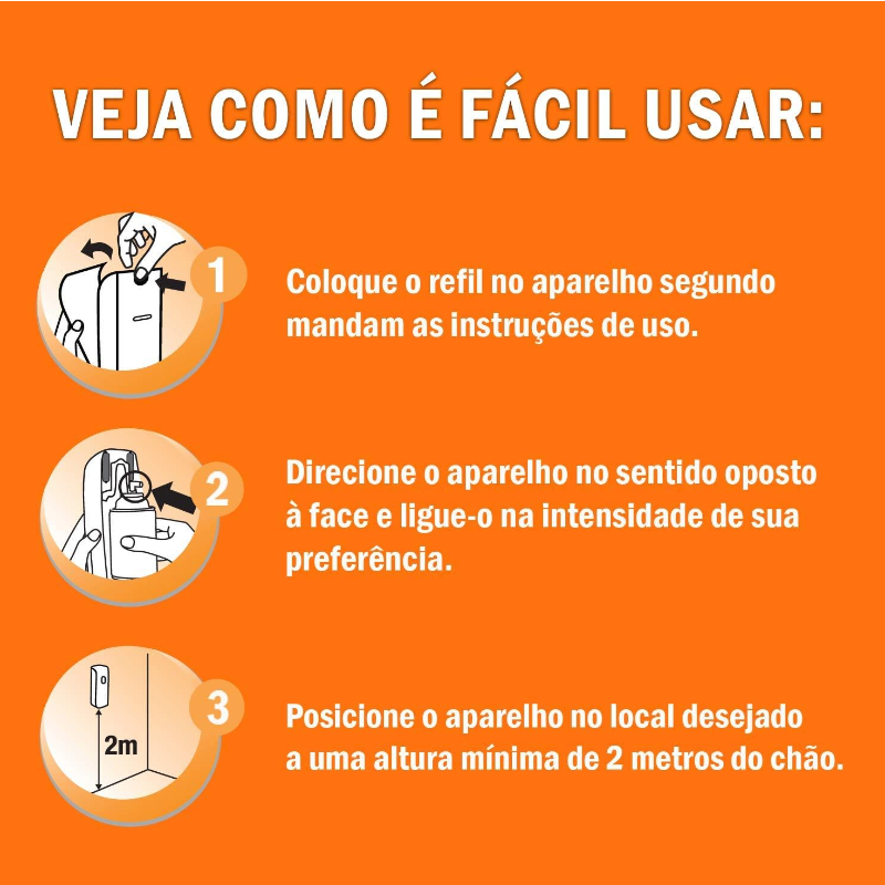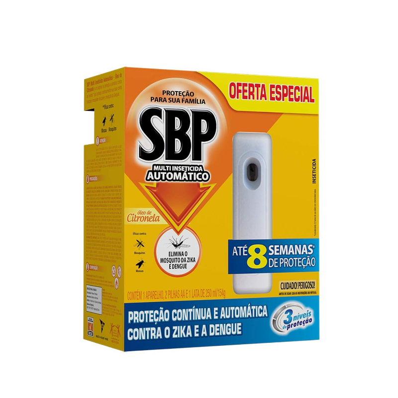 Sistema de proteção automático contra os insetos. Sua casa protegida contra moscas e mosquitos. Diferentemente de um inseticida aerossol comum, SBP multi-inseticida automático libera microsprays continuamente, mantendo você, sua família e sua casa protegida contra os insetos dia e noite. Coloque o refil no aparelho segundo mandam as instruções de uso, direcione o aparelho no sentido oposto à face e ligue-o na intensidade de sua preferência; posicione o aparelho no local desejado a uma altura mínima de 2 metros.