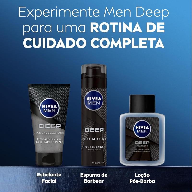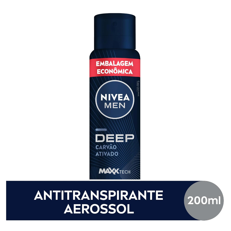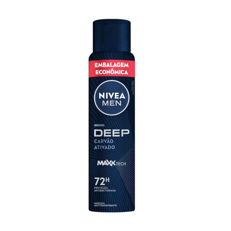 O que é? NIVEA MEN Antitranspirante Aerossol Deep Carvão Ativado 200 ml protege contra suor e mau odor. São 72 horas de proteção com uma fragrância duradoura e exclusiva. Sua tecnologia com carvão ativado promove uma poderosa proteção contra bactérias reduzindo-as em até 99,9%*. **Teste in-vitro conduzido com Corynebacterium jelklum e Staphylococcus epidermidis. Para que serve? Com fórmula exclusiva que garante máxima eficácia antitranspirante e com a presença do Carvão Ativado, o Antitranspirante NIVEA MEN Deep Aerossol deixa a pele das axilas limpa e fresca por mais tempo, evitando o acúmulo de bactérias que possuam causar mau odor, e ainda conta com uma fragrância única e duradoura. Com ele, sua proteção está garantida a todo momento. Benefícios e diferenciais: - Embalagem econômica - 72 horas de proteção - Fórmula com Carvão Ativado - Reduz até 99,9% das bactérias* - Fragrância duradoura - Dermatologicamente testado - Para uma axila limpa e sensação de secagem rápida **Teste in-vitro conduzido com Corynebacterium jelklum e Staphylococcus epidermidis.