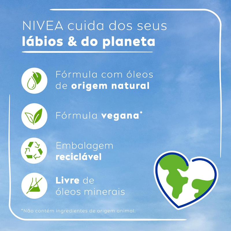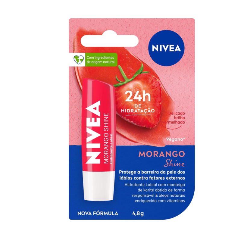 O que é? Hidratante labial que oferece cuidado e proteção por 24h. Item indispensável para manter os lábios sempre macios a qualquer hora do dia. Conheça! Para que serve o Hidratante Labial Nivea Morango Shine? Com óleos naturais na composição, deixa os lábios hidratados. Tem um delicioso cheiro de morango e pigmentos brilhantes que dão mais vida ao seu sorriso. Benefícios e diferenciais - Livre de óleos minerais - Aplicação uniforme sem precisar de espelho - Embalagem reciclável - Com óleos de abacate e de jojoba Como usar o Hidratante Labial Nivea Morango Shine? Deslize o produto sobre os lábios. Reaplique sempre que necessário. Uma unidade de embalagem contém 4,8g