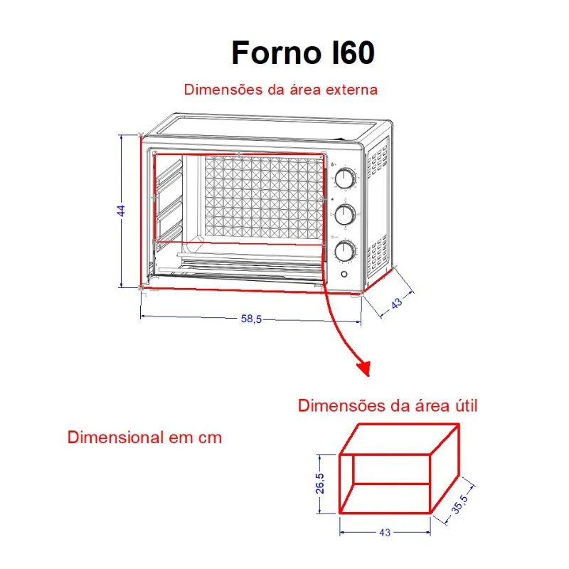 Capacidade de 60L.Temperatura mínima de 70 °C e máxima de 300 °C.Termostato para controle de temperatura e função de temporizador. Acessórios incluídos: bandeja de migalhas. Dimensões: 57.6 cm de largura, 41.25 cm de altura e 45.2 cm de profundidade.