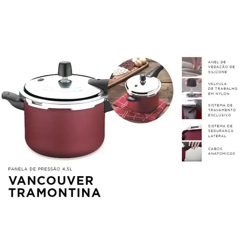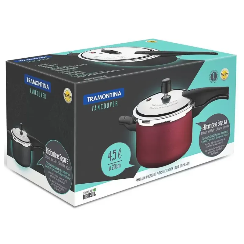Para você que não perde a oportunidade de reunir a família e os amigos para uma refeição especial, precisa oferecer também, utensílios para que esses momentos fiquem gravados na memória de todos. Já pensou em ter em sua cozinha uma panela de pressão eficiente, segura e resistente, que além de colorida e linda, também, não grude os alimentos? Pois, a panela de pressão Tramontina Vancouver em alumínio com revestimento interno e externo antiaderente Starflon Max vermelho 20cm de diâmetro 4,5L é tudo isso e muito mais! Com um lindo revestimento interno e externo em antiaderente Starflon Max na cor vermelha, ela será a estrela do seu fogão. Ela é produzida em alumínio com espessura que proporciona o cozimento rápido e uniforme dos alimentos e vem na vibrante cor vermelha. É uma panela que possui alça e cabos antitérmicos para facilitar o manuseio e conta com três válvulas de segurança que oferecem maior proteção durante o uso. Com certeza, a escolha perfeita para completar seu ambiente e ser a protagonista em sua cozinha! Com ela você prepara diversas receitas que vão agradar o paladar da família toda.