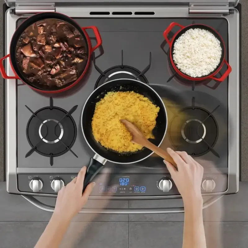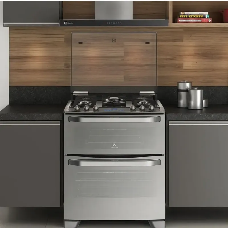 O design moderno do fogão com mesa de vidro temperado vai deixar a sua cozinha mais elegante e sofisticada. As grades individuais facilitam a limpeza e deixam o fogão ainda mais bonito. O design full glass espelhado da porta frontal adiciona ainda mais modernidade ao eletrodoméstico. O painel blue touch, com seis funções pré-programadas facilitam o dia a dia e o manuseio desse fogão Elextrolux . Manter aquecido é uma funcionalidade que mantém os alimentos na temperatura ideal até o momento de servir, já o grill doura carnes ou aves e gratina massas deixando suas refeições mais saborosas. O queimador tripla chama acelera o processo de cocção dos alimentos, tornando o preparo mais rápido e eficiente. O acendimento super automático é rápido e seguro, basta você girar o botão, sem a necessidade de apertar qualquer botão de ignição. O vidro triplo da porta isola adequadamente o calor do fogão de piso , melhorando inclusive o tempo de preparo das refeições e evitando acidentes com animais e crianças. A grande opção do mercado só poderia ser Electrolux!