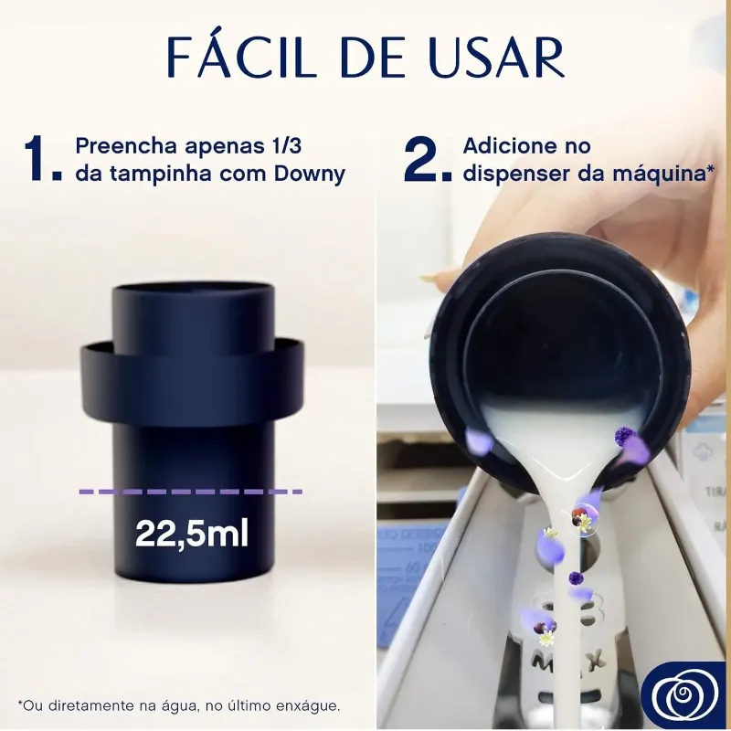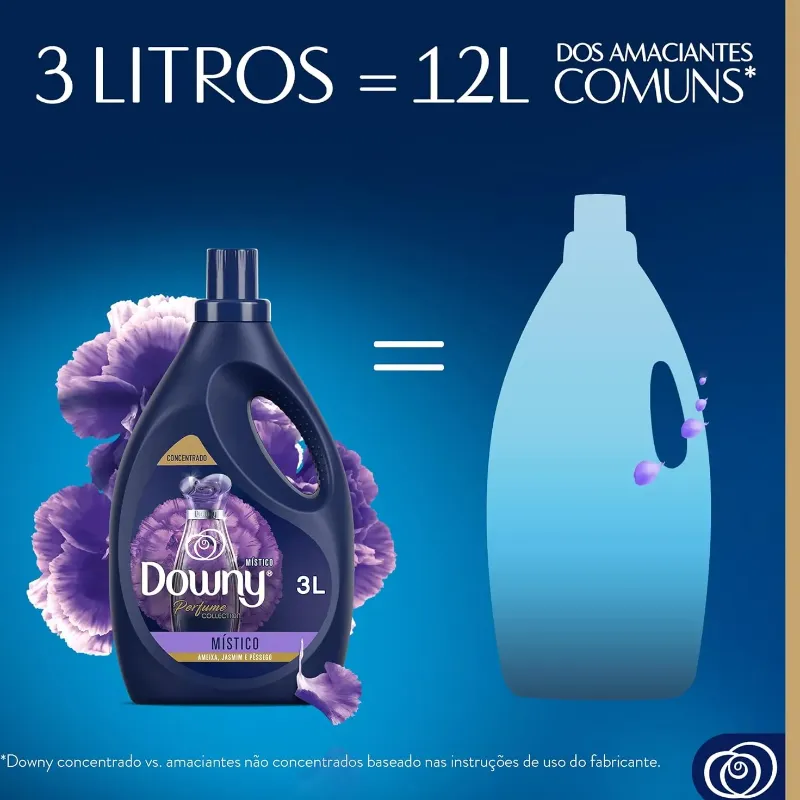 O perfume do Amaciante Downy Concentrado Perfume Collection Místico é único. Imagine um perfume sofisticado frutado, um pouco mais doce, com notas de baunilha, ameixa, jasmim e pêssego: uma mistura inconfundível. Suas roupas vão ficar com esse cheirinho gostoso por muito mais tempo*, isso porque o Amaciante Downy Místico possui fórmula com microcápsulas de perfume que se ativam a cada toque e às protege contra maus cheiros°, incluindo fumaça, cheiro de fritura e peixe. Além de super cheirosas, as roupas também ficam macias e fofinhas, muito fáceis de passar. O amaciante da marca Nº1 do Brasil¨ tem um alto rendimento, de até 132 lavagens, pois a embalagem de 3L equivale a 12 litros de um amaciante diluído comum^. Para utilizar o seu amaciante Downy não tem segredo, é só adicionar a dose indicada na embalagem no dispenser da máquina de lavar ou diretamente na água durante o último ciclo de enxágue, para um perfume sofisticado e que dura mais*. Se combinado com o Sabão Líquido Ariel, as roupas ficam leves, confortáveis e lisinhas na hora de passar, além de ficarem protegidas contra os danos da lavagem. Modo de Usar: Para lavadoras de 9 a 14 kg ou lavagem à mão, utilize 1/3 de tampa (22,5 ml). Para mais perfume ou lavadoras maiores (+15 kg), utilize 1 tampa. ^ Downy concentrado vs. amaciantes não concentrados baseado nas instruções de uso do fabricante ° Baseado em provas realizadas com conjunto de odores representativos. ¨ Baseado em dados Nielsen Brasil, para o ano de 2021 * Concentração de perfume depositada e liberada do tecido seco medida por métodos analíticos vs. amaciantes não concentrados.