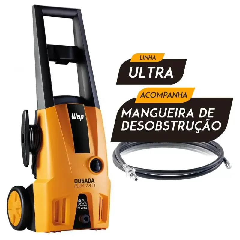 A Desobstruidora e Lavadora de Alta Pressão WAP Ousada Plus Ultra 2200 é uma máquina compacta, leve e eficiente para o dia a dia utilizando jato de água com alta pressão. Na versão desobstruidora, a WAP de Alta Pressão é ideal para desentupir canos, calhas e tubulações. Na versão Lavadora, pode utilizá-la em limpezas mais exigentes no seu dia a dia, oferecendo mais pressão, potência e eficiência com um ótimo custo-benefício. É ideal para lavar calçadas, bicicletas, motos, carros e paredes com rapidez e agilidade, além de economizar até 80% de água se comparada à mangueira tradicional.