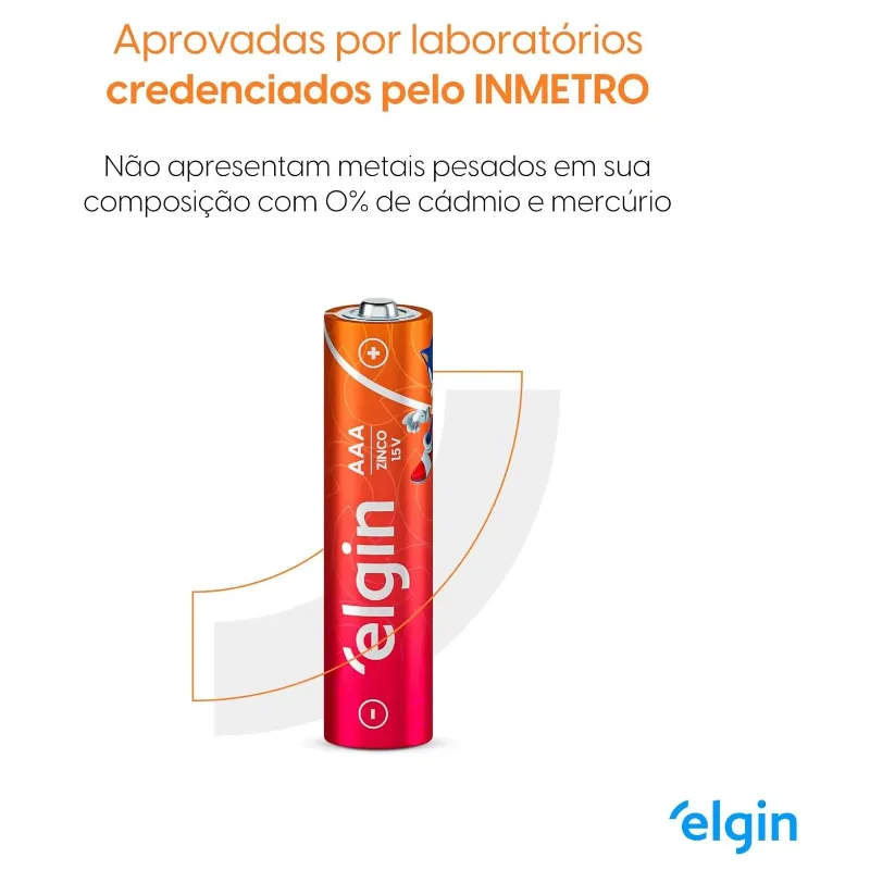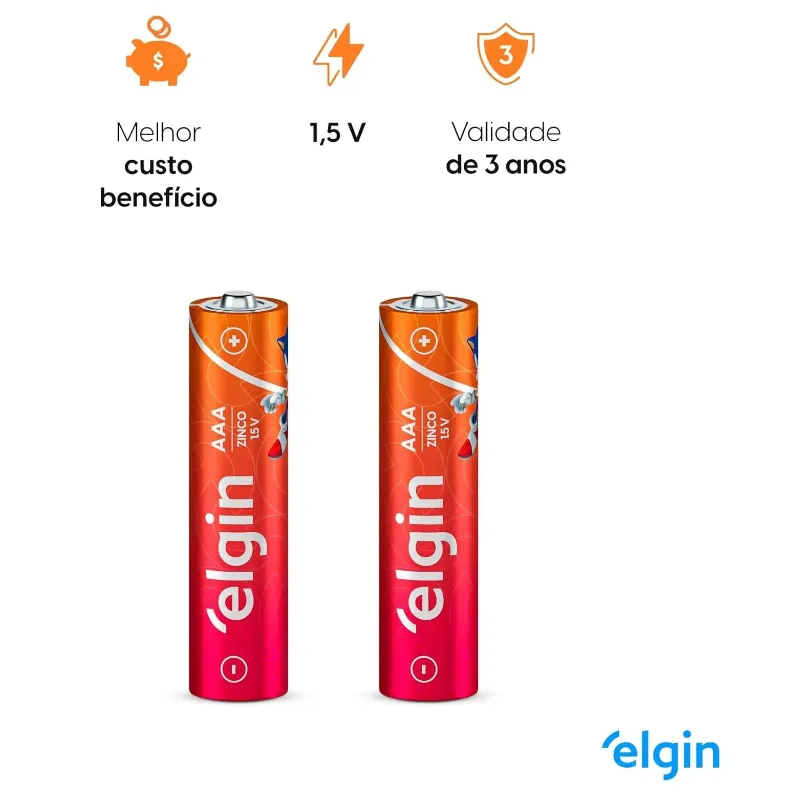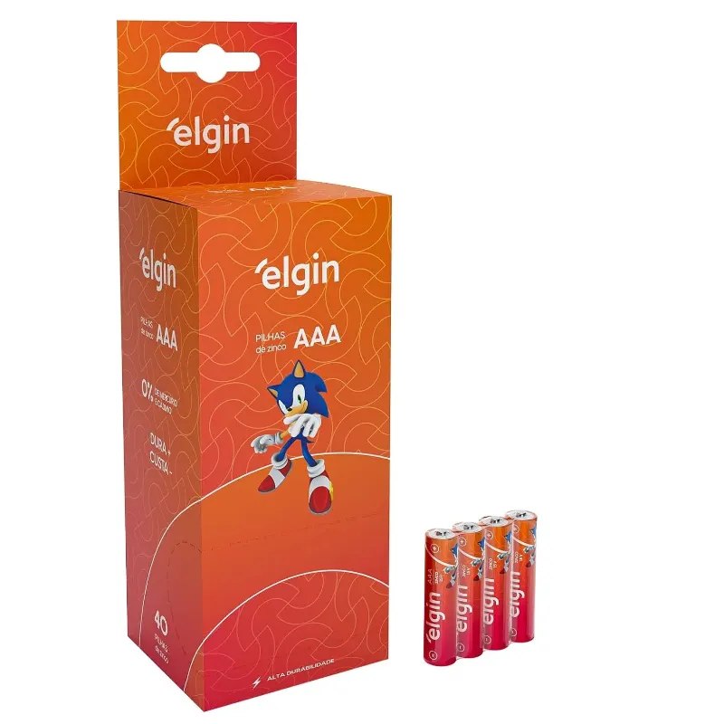 As pilhas de zinco da Elgin são parceiras Sonic the Hedgehog, têm voltagem de 1.5V e são perfeitas para brinquedos, controle remotos, lanternas e outros aparelhos que requerem descargas de energia rápidas e fortes. Unindo econômicas e qualidade, as pilhas Elgin foram aprovadas em todos os quesitos e têm ótima relação custo/benefício. Assim, você economiza e ainda conta com pilhas de alta qualidade. Além disso, foram testadas e aprovadas, entre 11 marcas de pilhas do mercado avaliadas em testes do INMETRO, as pilhas Elgin apresentaram um resultado excelente na relação custo por hora útil e não agridem o meio ambiente porque têm 0% de metais pesados em sua composição.