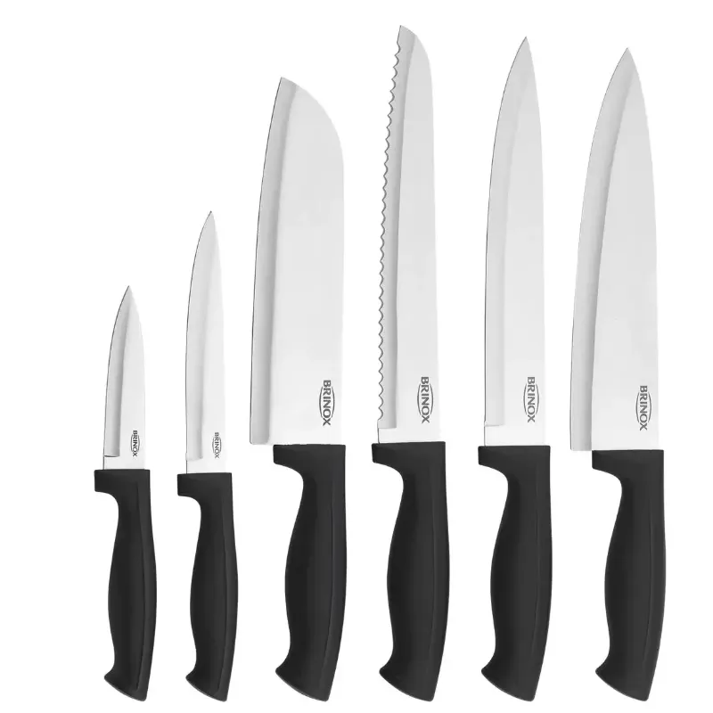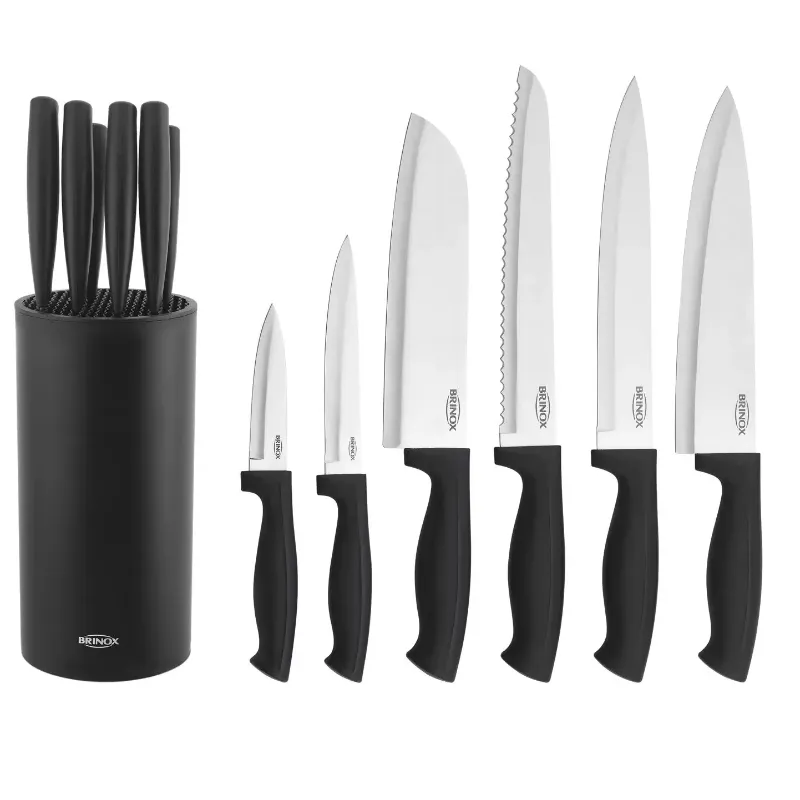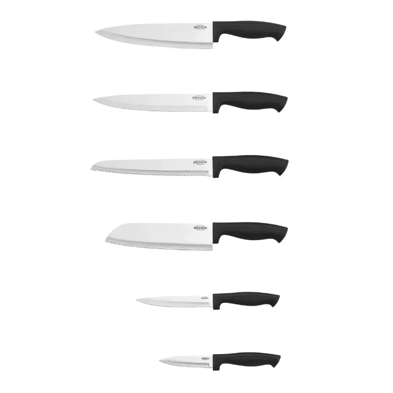 Que tal experimentar esse conjunto de facas que traz diversas opções para preparar as suas receitas favoritas? O Jogo de Facas da Brinox para cozinha, com o cabo feito de polipropileno e a lâmina de aço inox. Vem com 7 peças, sendo uma faca para legumes, uma de utilidades, uma de pão, faca Santoku, a faca do chefe e uma faca de cozinha, acompanhados de um cepo para guardá-las! Tome cuidado, recomenda-se não usar na máquina de lava-louças, mas sim com água e sabão neutro, junto a uma esponja macia! Deixe sua cozinha mais sofisticada com esse jogo de facas da Brinox!
