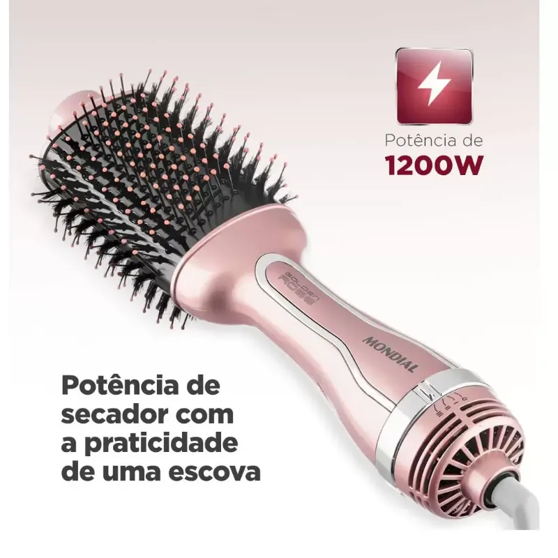 Conheça a Escova Secadora Golden Rose ES-02 da Mondial: ela é 3 em 1, você seca, alisa e modela utilizando apenas um produto. É muita praticidade! Fique linda e com a praticidade de cuidar dos cabelos com apenas uma mão! A escova tem 1200W de potência para secar seu cabelo com rapidez e eficiência, e revestimento com Cerâmica e Turmalina, mineral que emite íons negativos ao ser ativado pelo calor. Os íons fecham as cutículas dos fios, deixando-os mais macios, brilhantes e sem frizz. O formato com design oval da escova é perfeito para alisar, além de também ser um aliado para quem quer dar volume às mechas. Com 3 opções de variação de temperatura: ajuste a intensidade do calor de acordo com seu tipo de cabelo. Os formatos diferentes das cerdas permitem alinhar e modelar o cabelo ao mesmo tempo. A ponteira da escova Mondial não aquece e protege suas mãos durante o uso. O fio é giratório e não enrola durante o uso. Cabo embolado nunca mais!