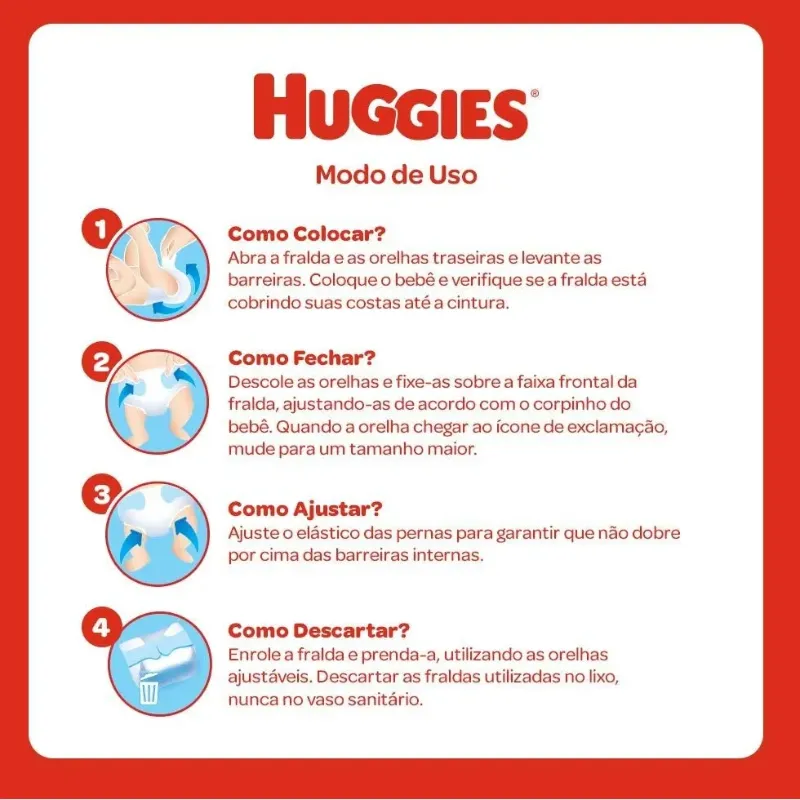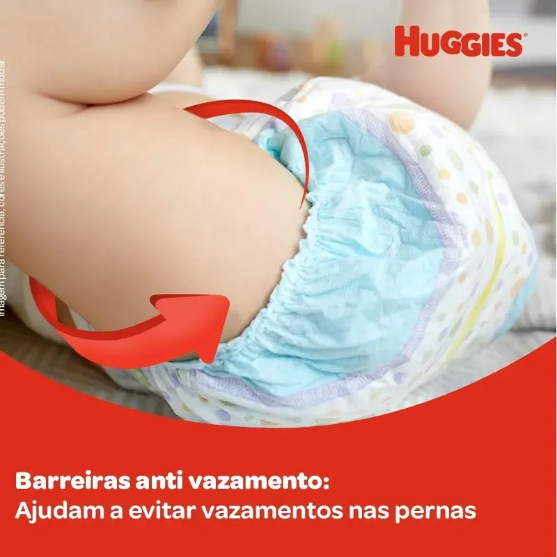 Fralda huggies tripla proteção. Mais absorção menos trocas, por até 12 horas. Comparado à versão anterior pode variar de acordo com hábitos e características do bebê.