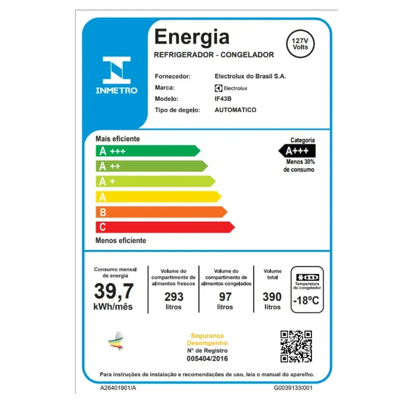 A Refrigerador Electrolux Duplex Frost Free Efficient com AutoSense cor Black Inox Look 390L IF43B oferece mais qualidade de armazenamento para seus alimentos, além de economia de energia. O design moderno e a elegante cor preta garantem mais sofisticação para a sua cozinha. A exclusiva tecnologia AutoSense reconhece sua frequência de uso e passa a controlar automaticamente a temperatura usando Inteligência Artificial, que prolonga a vida dos alimentos por até 30%¹ mais tempo. A Tecnologia Inverter é responsável por garantir a estabilidade da temperatura, garantindo que os alimentos armazenados sejam mantidos frescos por mais tempo, com economia de energia de até 30%², através da eficiência energética A+++. A Gaveta HortiNatura é mais uma aliada para preservar o frescor de frutas e vegetais por até 2x³ mais tempo. Possui uma vedação especial, que evita o contato direto com a temperatura interna da geladeira, reduzindo o desperdício desse tipo de alimentos. O sistema FastAdapt permite que as prateleiras deslizantes podem ser configuradas de diversas formas para armazenar alimentos de diferentes tamanhos e formatos. O MoveAdapt permite mover facilmente os compartimentos graças aos dois trilhos, se adaptando exatamente ao que precisa. O Separador de garrafas e porta-condimentos ajuda a organizar melhor o interior da geladeira e fornece um pequeno recipiente para ser utilizado para guardar temperos.