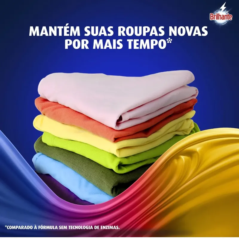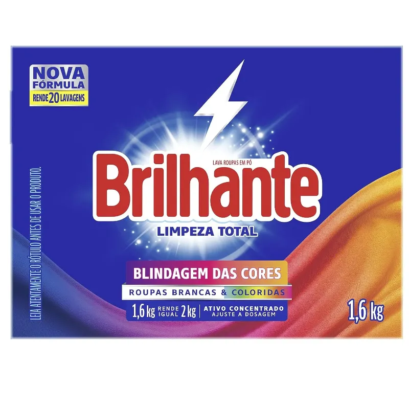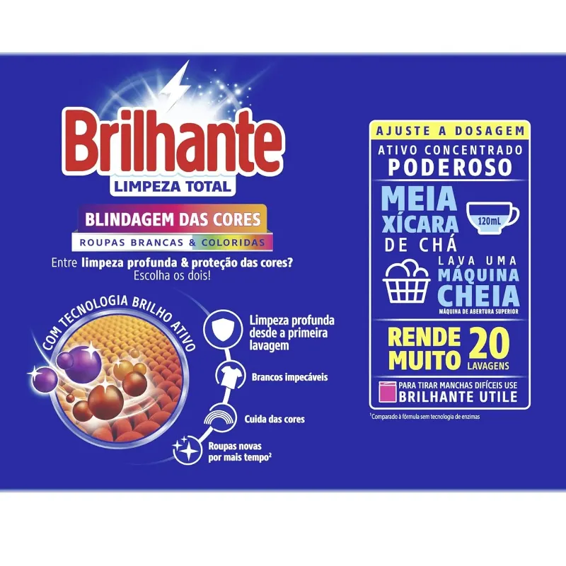 A nova fórmula do Sabão em Pó Brilhante Limpeza Total combina os melhores resultados de limpeza com o cuidado dos tecidos: de um lado, o poder das enzimas, que proporciona uma limpeza profunda ao mesmo tempo que evita que a sujeira volte a se depositar nas roupas; do outro, a tecnologia Brilho Ativo que evita o amarelamento das roupas brancas e mantém os coloridos mais vivos. O Lava-Roupas em Pó Brilhante Limpeza Total limpa profundamente suas roupas sem agredir os tecidos, ajudando a prevenir os sinais de desgaste das suas peças preferidas após cada lavagem, além de permitir a blindagem das cores, deixando-as muito mais vivas e impactantes. Entre limpeza profunda e blindagem da cor? Escolha os dois! Com Brilhante, você sempre leva mais com a solução completa! Brilhante limpa as suas roupas brancas e coloridas enquanto cuida das cores. É um ativo concentrado poderoso. Brilhante quer se tornar um aliado nas tarefas diárias de seus consumidores e busca trazer praticidade com produtos inovadores e que todo mundo possa usar, diminuindo o peso das tarefas e liberando tempo para as demais atividades do dia a dia. Acesse o nosso website para saber mais. *Comparado à fórmula sem tecnologia de enzimas.