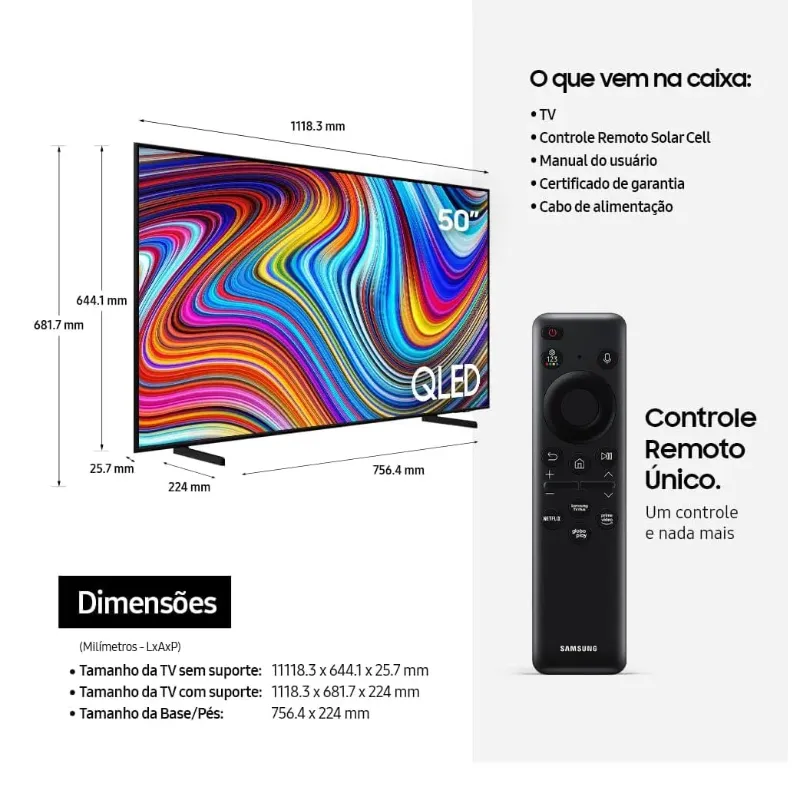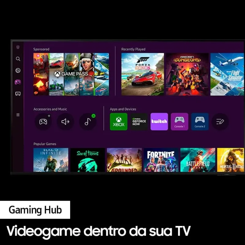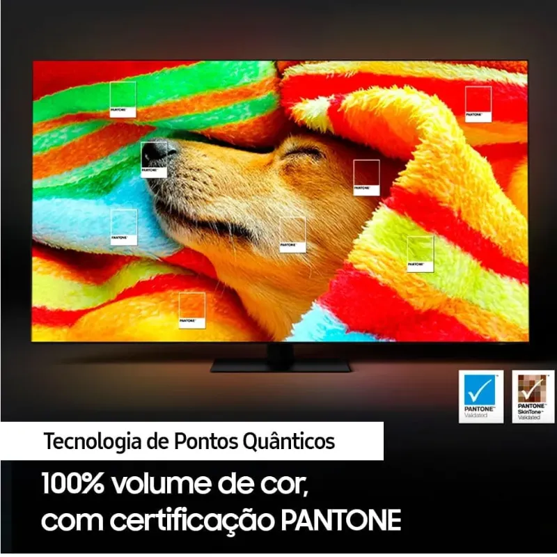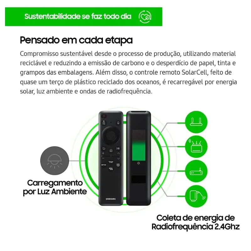 Desfrute do máximo da qualidade de imagem em 4K, na primeira TV certificada pela PANTONE, referência mundial em controle e especificação de cores, e aproveite 1 bilhão de tons vibrantes Processador exclusivo da Samsung, que proporciona a melhor experiência de visualização ao realizar o upscaling de qualquer conteúdo para resolução próxima a 4K conforme a cena. Seja na parede ou no rack, essa TV de apenas 2,5cm de espessura combinará perfeitamente com seu espaço. Além disso, ajuste a base da TV na altura que preferir deixando o espaço ideal para posicionar uma Soundbar Samsung. A nova plataforma de games dentro da TV garante acesso a mais de 1000 jogos nas plataformas Xbox Game Pass e Nvidia GeForce Now, sem necessidade de downloads ou de consoles, além de recomendar conteúdos,transmissão de lives via Twitch e agrupar tudo sobre jogos em uma só interface. Surpreenda os seus adversários dominando a partida em uma TV que proporciona mais fluidez a cada cena. Tenha a melhor visualização do seu game com opções de formato de tela de 21:9 ou 32:9, além de um menu intuitivo para você consultar o input lag, FPS, HDR e muito mais. A experiência do som 3D permitirá que você fique totalmente imerso no áudio dos seus filmes e séries, como se estivesse no meio da ação junto da imersão do som da soundbar somada aos alto-falantes da TV. Avalia automaticamente os ruídos do ambiente e calibra o som da sua TV para uma experiência sonora potencializada. Intensificamos o nosso compromisso sustentável desde o processo de produção, utilizando material reciclável e reduzindo a emissão de carbono e o desperdício de papel, tinta e grampos, além de oferecer uma solução criativa e usual para a casa, já que as caixas dos produtos viram utensílios ou objetos decorativos. Além disso, o controle remoto SolarCell, agora ainda mais compacto, é feito de quase um terço de plástico reciclado dos oceanos e é recarregável por energia solar, luz ambiente e ondas de radiofrequência, evitando o desperdício