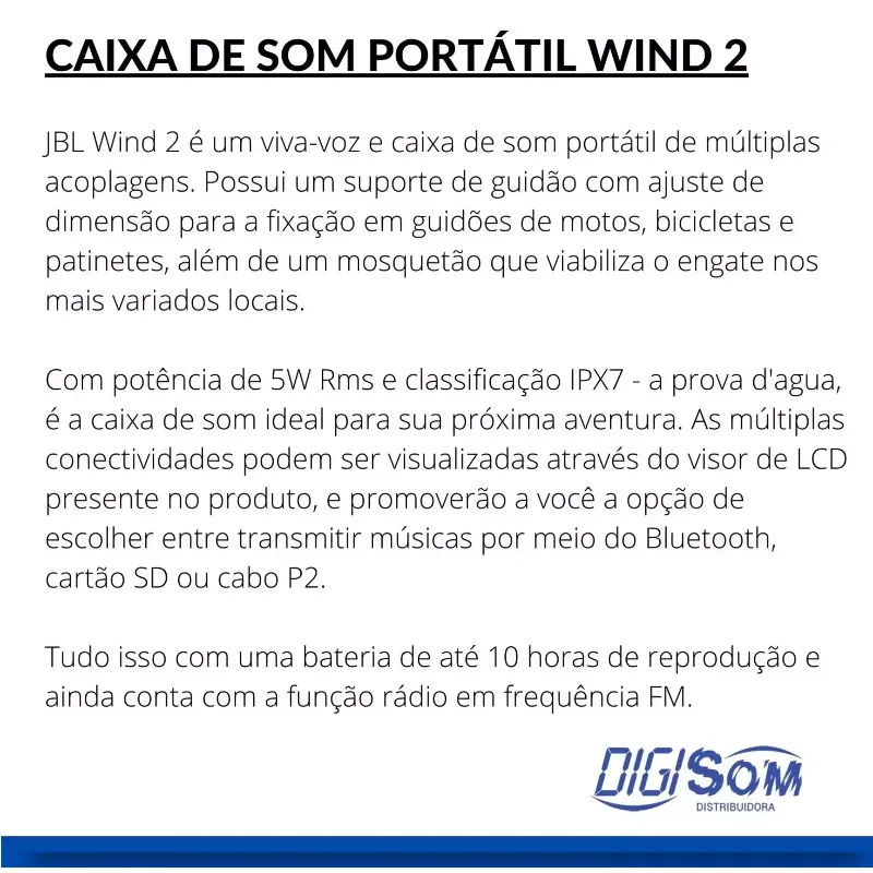 JBL Wind 2 é um viva-voz e caixa de som portátil de múltiplas acoplagens. Possui um suporte de guidão com ajuste de dimensão para a fixação em guidões de motos, bicicletas e patinetes, além de um mosquetão que viabiliza o engate nos mais variados locais.