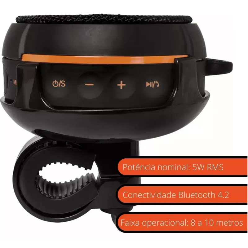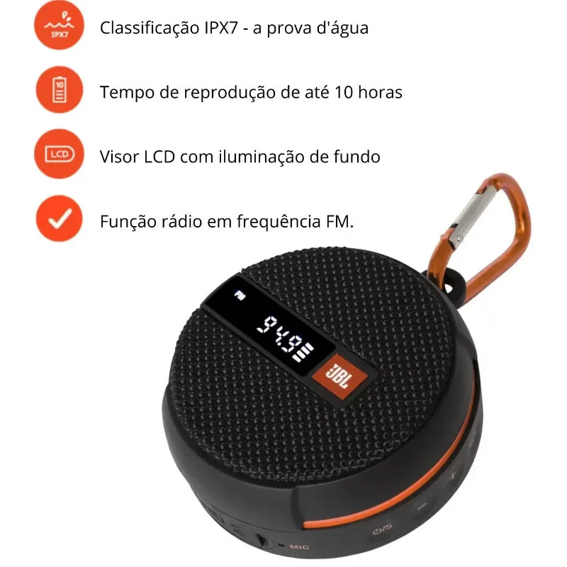 Com potência de 5W Rms e classificação IPX7 - a prova d'agua, é a caixa de som ideal para sua próxima aventura. As múltiplas conectividades podem ser visualizadas através do visor de LCD presente no produto, e promoverão a você a opção de escolher entre transmitir músicas por meio do Bluetooth, cartão SD ou cabo P2.