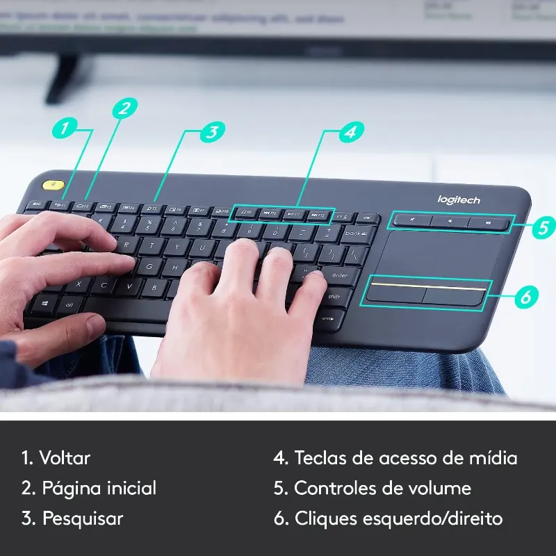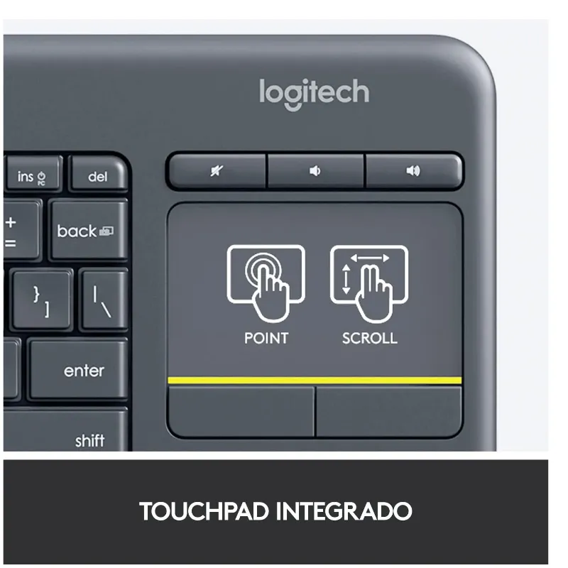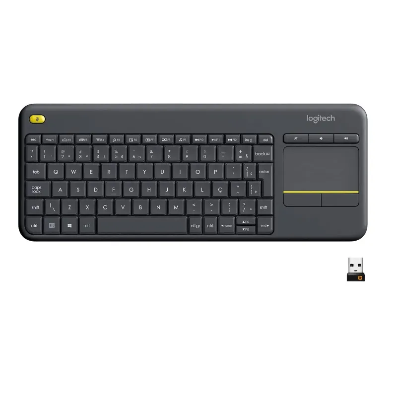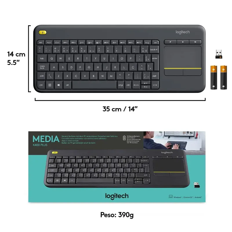 Desfrute de um controle direto do entretenimento do seu PC na sua TV com o K400 Plus. Assista a vídeos, navegue na Web, converse com amigos e muito mais sem ter que se levantar do sofá. O teclado possui layout ABNT2 e touchpad integrado que torna a navegação mais intuitiva e simples. Com alcance sem fio de 10 metros a diversão é garantida e sem interrupções. A configuração é simples, graças ao pequeno, receptor Unifying plug-and-play. As elegantes teclas de baixo perfil são confortáveis e silenciosas. Com autonomia de até 18 meses, você até vai se esquecer que o teclado precisa de pilhas.
