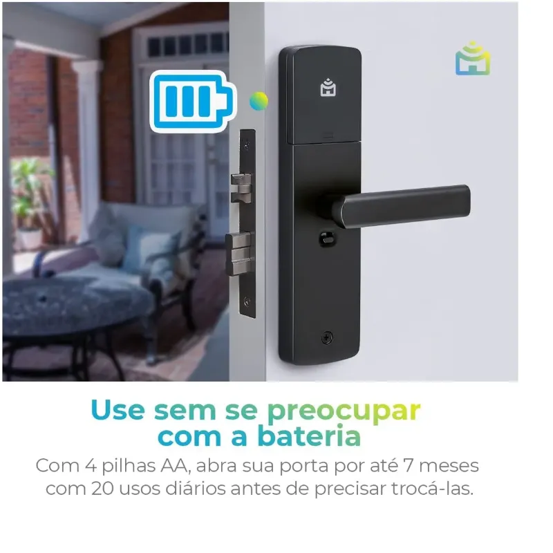 Fácil de instalar, é ideal para portas de 35 até 50mm. A fechadura é universal, ou seja, a maçaneta pode ser instalada para abrir para esquerda ou para direita e funciona com 4 pilhas AA com duração de 7 meses de uso*. Sim, mesmo sem energia e sem internet ela funciona! Nós pensamos em tudo. O aplicativo emite aviso de bateria baixa, assim você tem tempo de carregá-la antes de acabar.