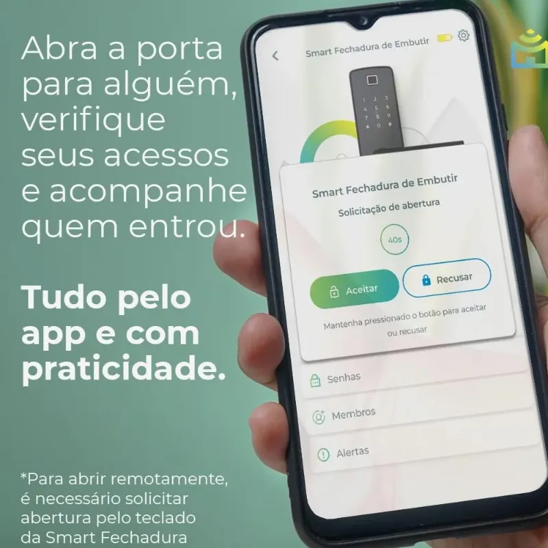 Chega de deixar a chave embaixo do tapete, com vizinhos ou porteiros, a Smart Fechadura de Embutir pode ser uma opção para monitorar a entrada de casa ou escritório e limitar o acesso a áreas específicas. Crie de forma prática senhas permanentes e temporárias para ter mais controle e flexibilidade. Para espaços de locação diária por aplicativo, basta ativar ou inativar as senhas de uso. Tudo com muita facilidade pelo Aplicativo Positivo Casa Inteligente.