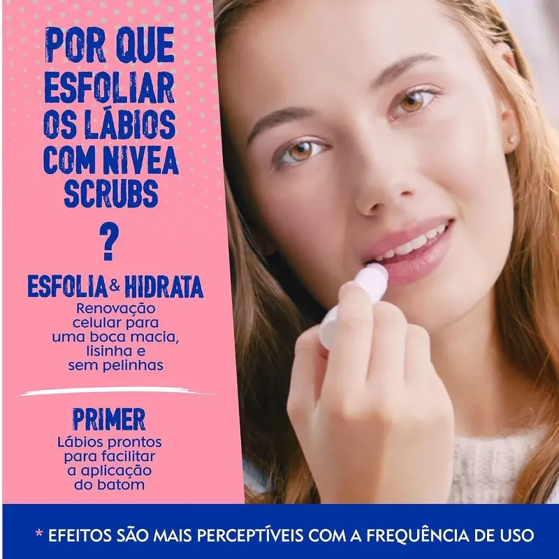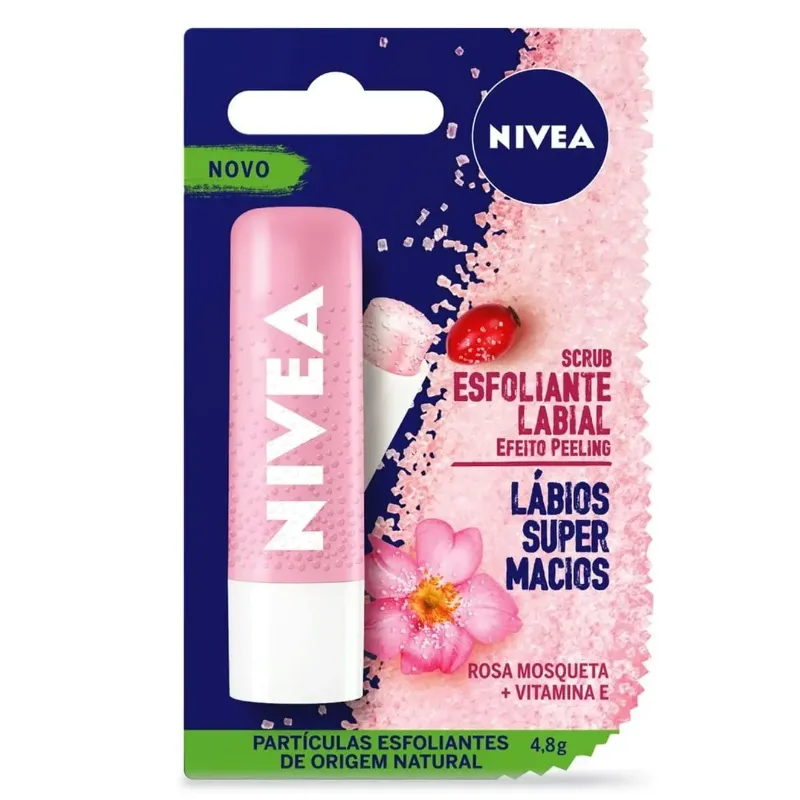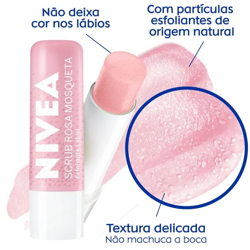 O que é? Conheça o novo NIVEA® SCRUB: esfoliante labial que renova a pele dos lábios, deixando-os macios e sem pelinha. Saiba mais! Para que serve o Esfoliante Labial Nivea Scrub Rosa Mosqueta? Enriquecido com óleo de Rosa Mosqueta e Vitamina E, contém partículas esfoliantes que se dissolvem após a aplicação. Experimente usar antes do batom ou do hidratante labial. Benefícios e diferenciais - Não deixa cor nos lábios - Pode ser usado todos os dias - Dermatologicamente testado - Lábios ainda mais macios! Como usar o Esfoliante Labial Nivea Scrub Rosa Mosqueta? Aplique até sentir as partículas esfoliantes. Friccione os lábios para as partículas se dissolverem. Não remova após o uso. Uma unidade de embalagem contém 4,8g