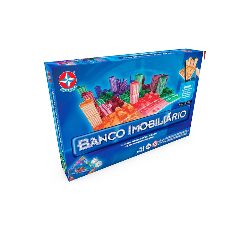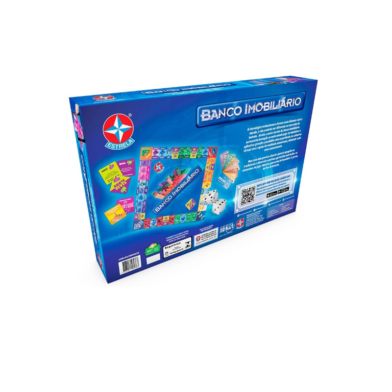 O mercado de imóveis se modernizou e está cada vez mais competitivo. Diversificar os investimentos virou palavra de ordem. O Banco Imobiliário Realidade Aumentada, é a nova versão do clássico jogo da Estrela e traz todo o dinamismo do mundo dos negócios para os dias de hoje. Além da dinâmica convencional do tabuleiro, os jogadores poderão interagir através do aplicativo e ver crescer incríveis construções em suas propriedades. Ainda mais diversão nesse clássico que atravessa gerações! *o uso do aplicativo é opcional, não interfere na dinâmica do jogo.