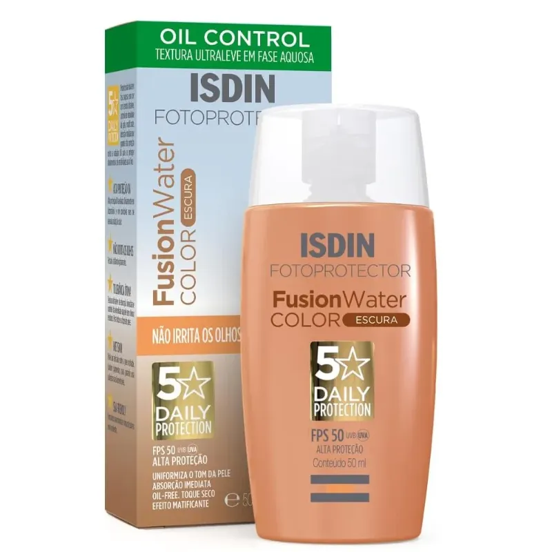 O Protetor solar facial ISDIN Fusion Water 5 Stars Color FPS 50 é um protetor solar facial com cor,de textura ultraleve à base de água e de uso diário. Fusion Water Color (cor escura) tem FPS 50 que uniformiza o tom da pele, disfarça as imperfeições proporciona cobertura natural e acabamento matificante. - Alta proteção UV FPS 50 avaliada clinicamente em laboratório e em condições reais de alta radiação solar. - Não irrita os olhos, testado oftalmologicamente. - Tolerância ótima com textura ultraleve de absorção imediata e controle da oleosidade da pele sem deixar resíduos. - Wet skin, pode ser aplicado na pele molhada. Contém pigmentos, para garantir uma cobertura das imperfeiçoes. - Sea Friendly, formulado para minimizar o impacto sobre o meio ambiente.