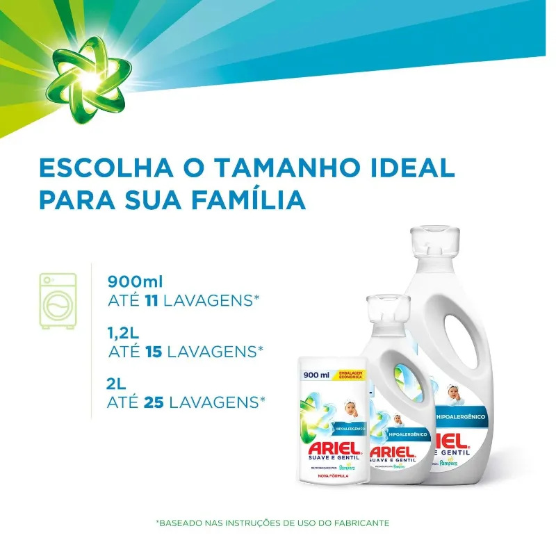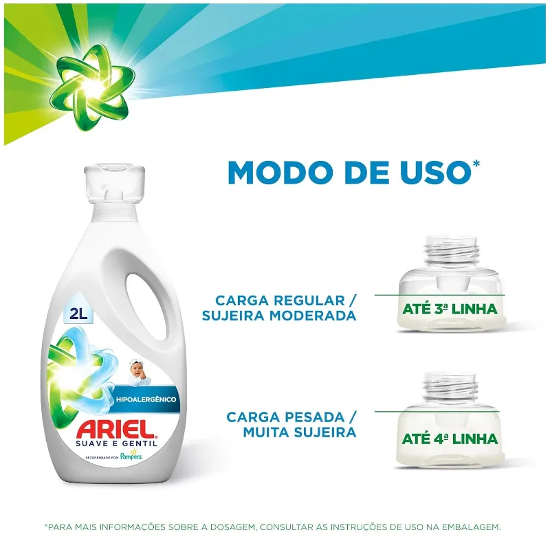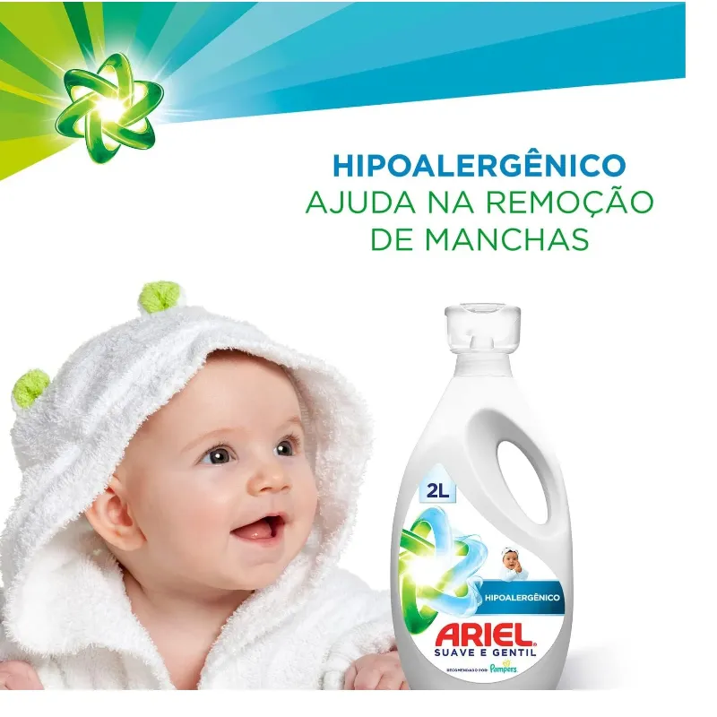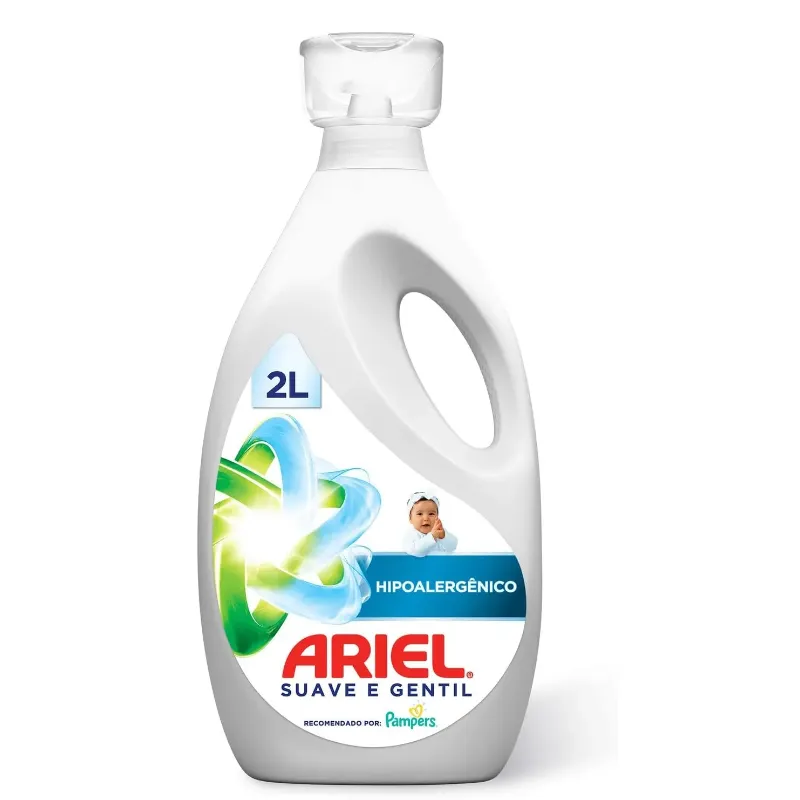 O sabão líquido Ariel Hipoalergênico Suave e Gentil é ideal para lavar roupas de bebê ou adicionar um cuidado extra caso você ou alguém na sua família tenha pele delicada. Ele foi desenvolvido para ser uma opção segura que não agride a pele e é eficaz na remoção de manchas. Este é um sabão líquido concentrado que não possui corantes e não deixa resíduos visíveis nos tecidos e nem na máquina de lavar, possui fórmula dermatologicamente testada. Por esses motivos é recomendado por Pampers para o cuidado com as roupas dos seus bebês. Por ser hipoalergênico é recomendado para pessoas de qualquer idade que tenham algum tipo de alergia ou sensibilidade na pele. Para proporcionar segurança a todos os tipos de pele, Ariel Hipoalergênico Suave e Gentil possui perfume e fórmula especialmente desenvolvidos para pessoas com pele delicada. Como todo sabão líquido de Ariel, Suave e Gentil, também penetra mais fundo nas fibras dos tecidos. Graças aos ingredientes ativos, limpa roupas brancas e coloridas com eficiência e remove manchas difíceis desde a primeira lavagem. Com tensoativos biodegradáveis.